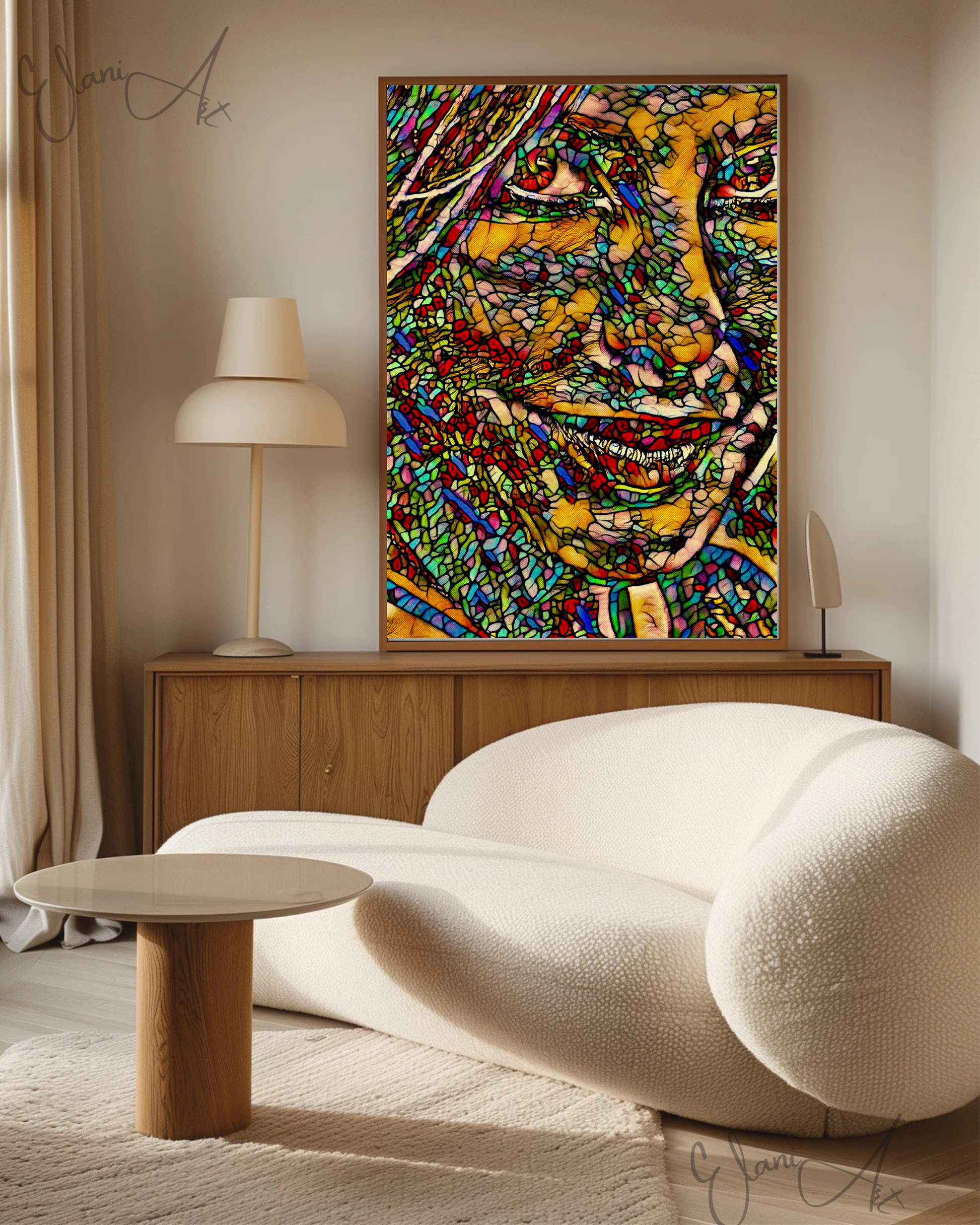 Uplift your room's decor with ElaniArt's AND YOU? Original Vibrant Colorful Woman Portraiture Face Smile Stained Glass Mosaic Impressionistic Wall Artwork Print by ElaniArt.