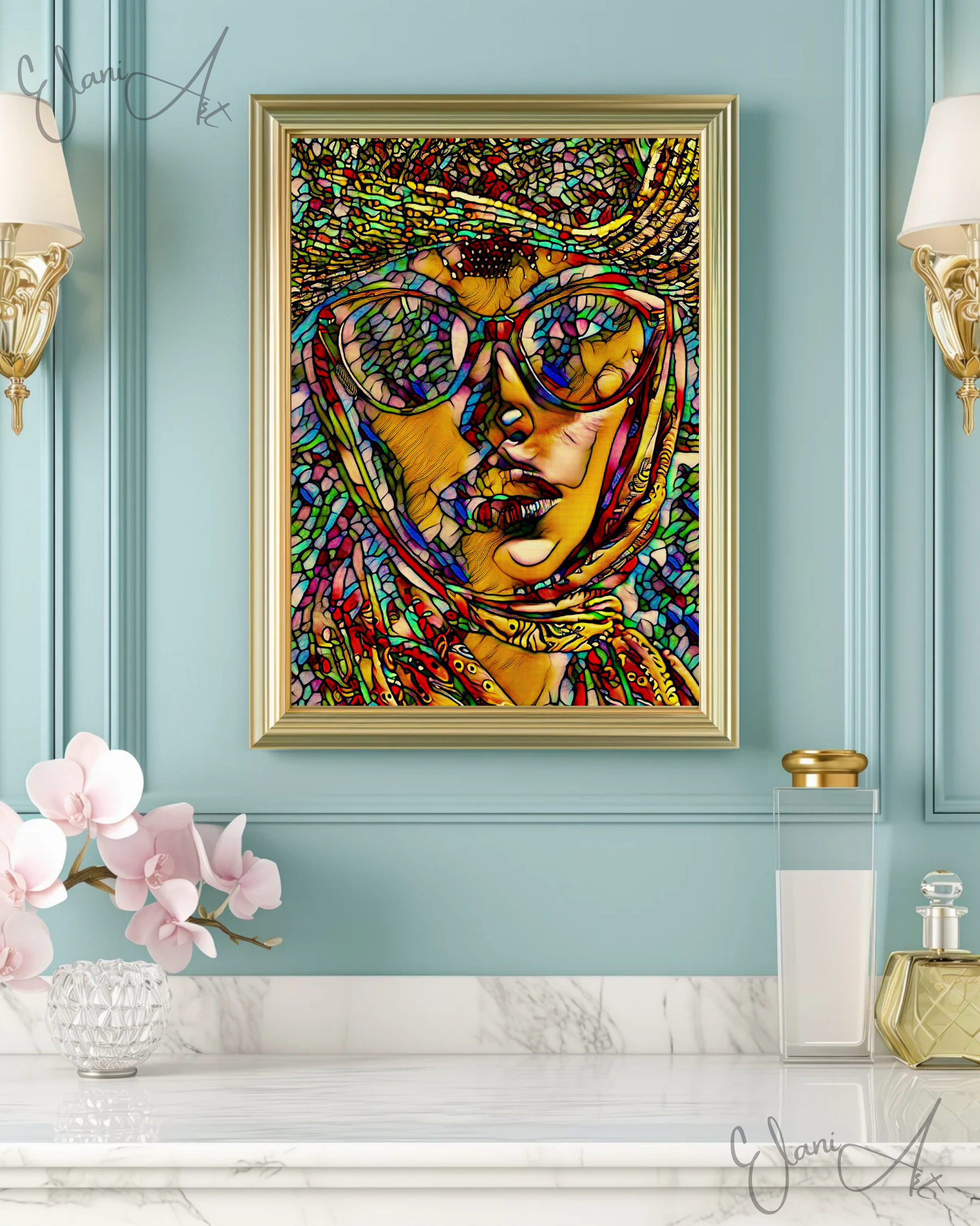 Uplift your room's decor with ElaniArt's CONVERTIBLE WIND Original Vibrant Colorful Woman Wearing Sunglasses, Scarf & Hat Stained-Glass Impressionistic Wall Artwork Print by ElaniArt.