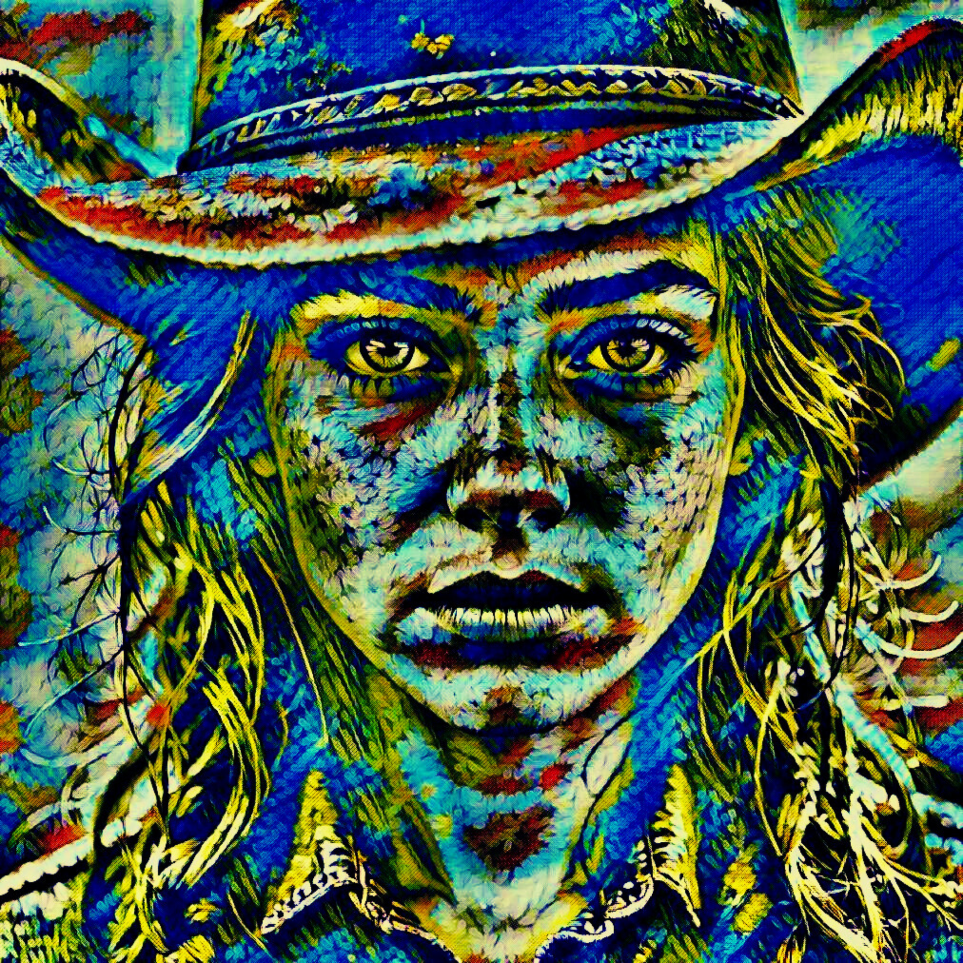 Uplift your room's decor with ElaniArt's COWGIRL STARE Original Vibrant Blue Green Cowgirl Woman Western Cowboy Hat Freckles Portrait Impressionistic Artwork Print by ElaniArt.
