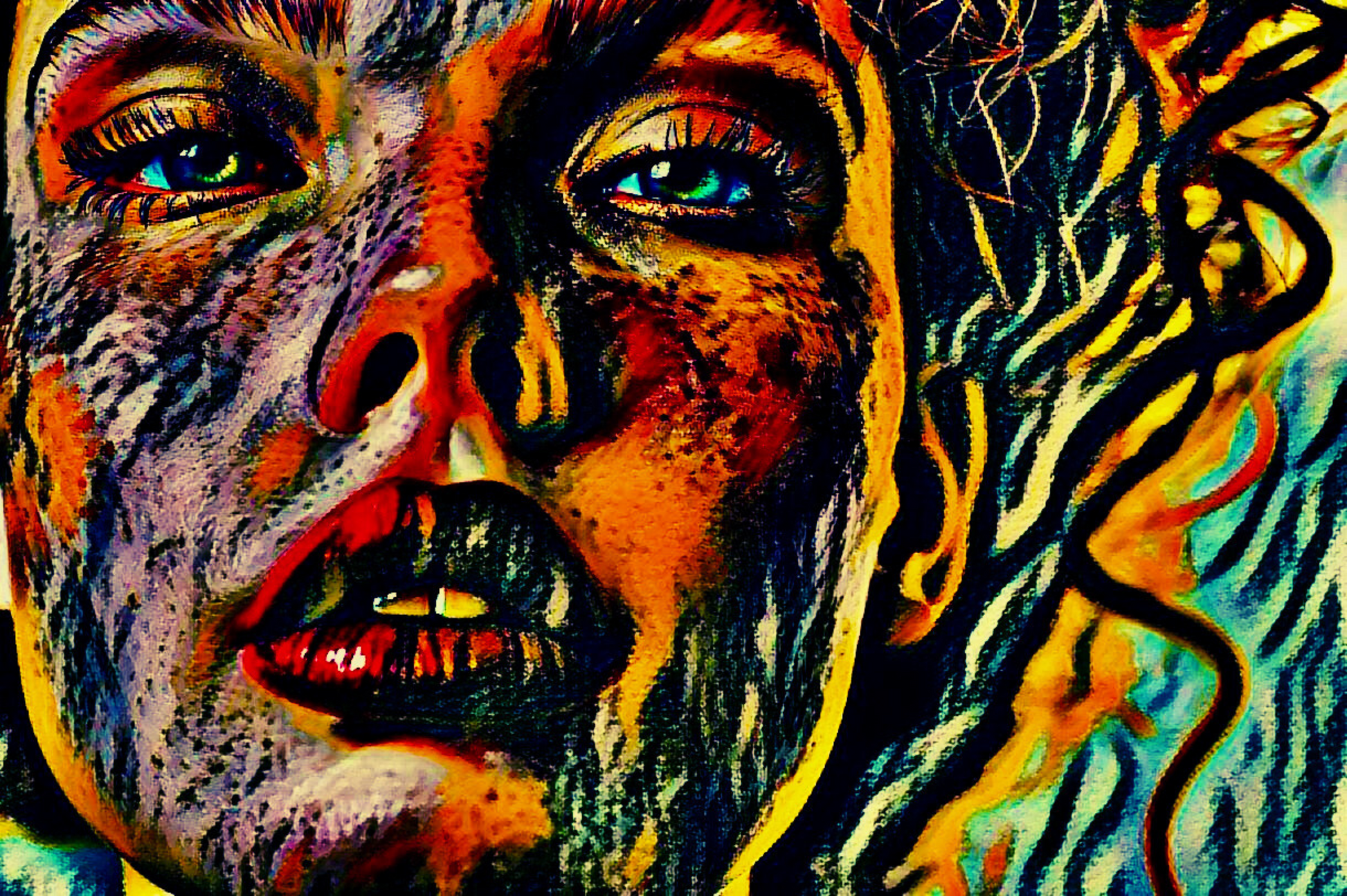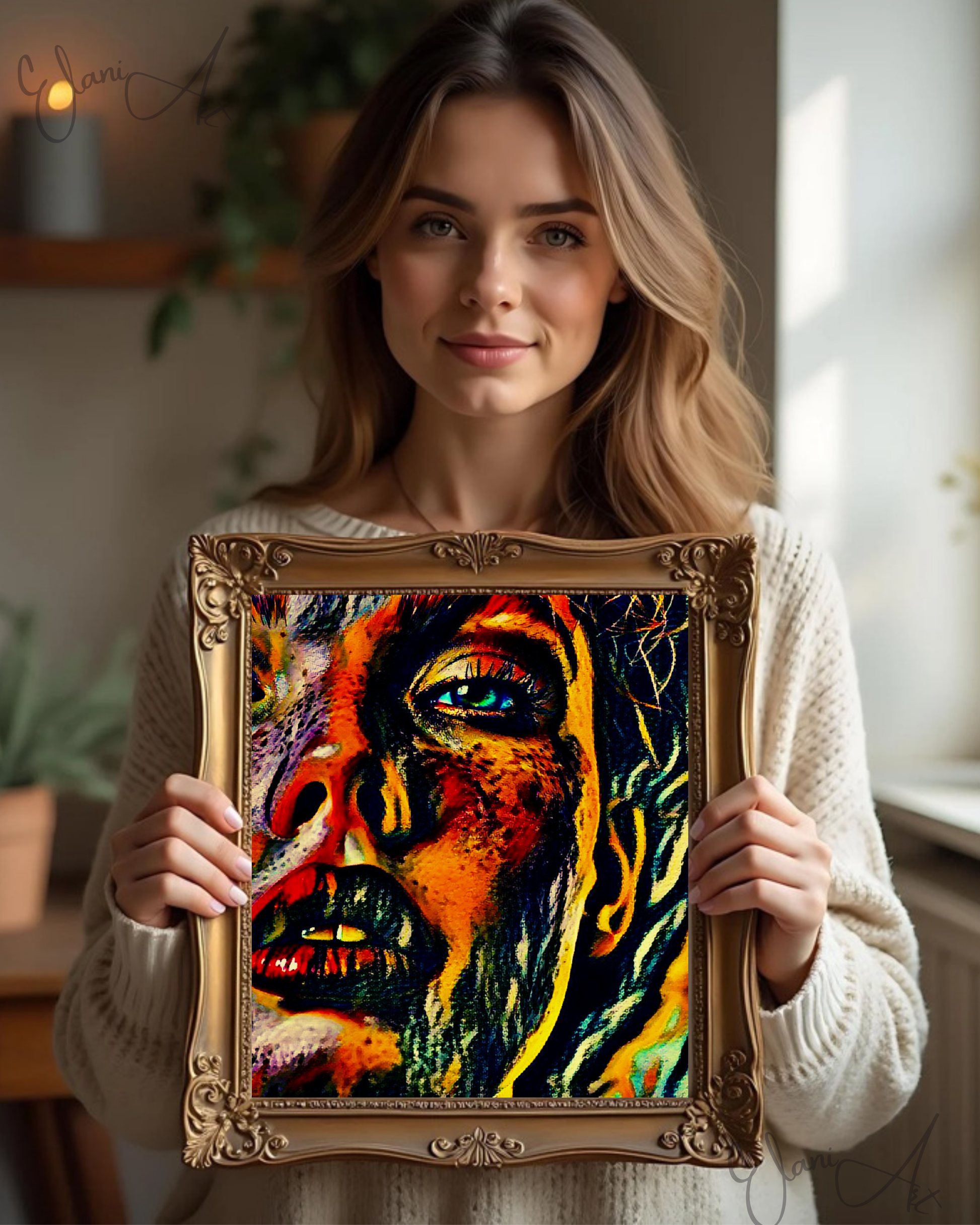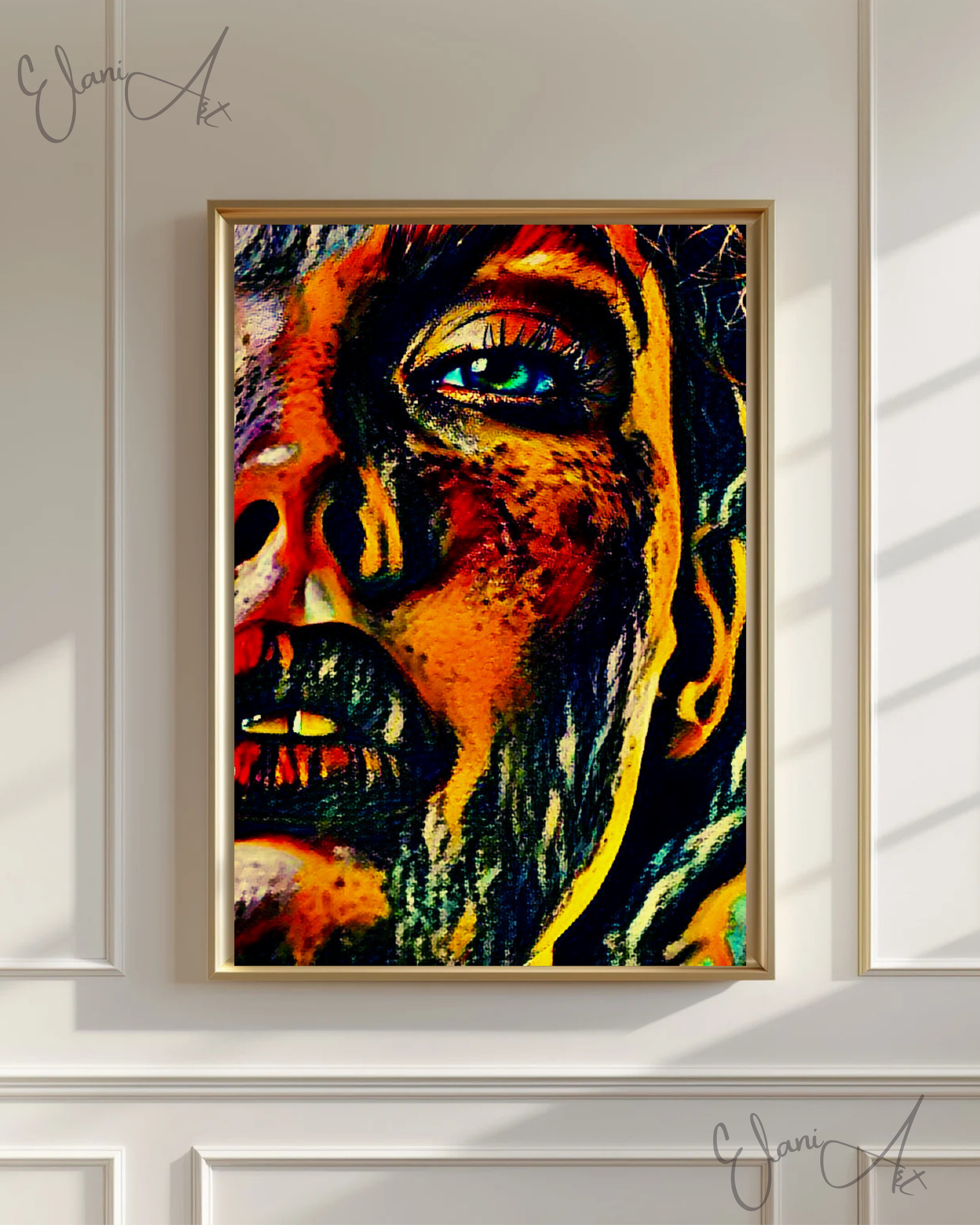 Uplift your room's decor with ElaniArt's EMMIE Original Vibrant Red Colorful Woman's Face Freckles Open Mouth Blue Eyes Portrait Impressionistic Wall Artwork Print by ElaniArt.