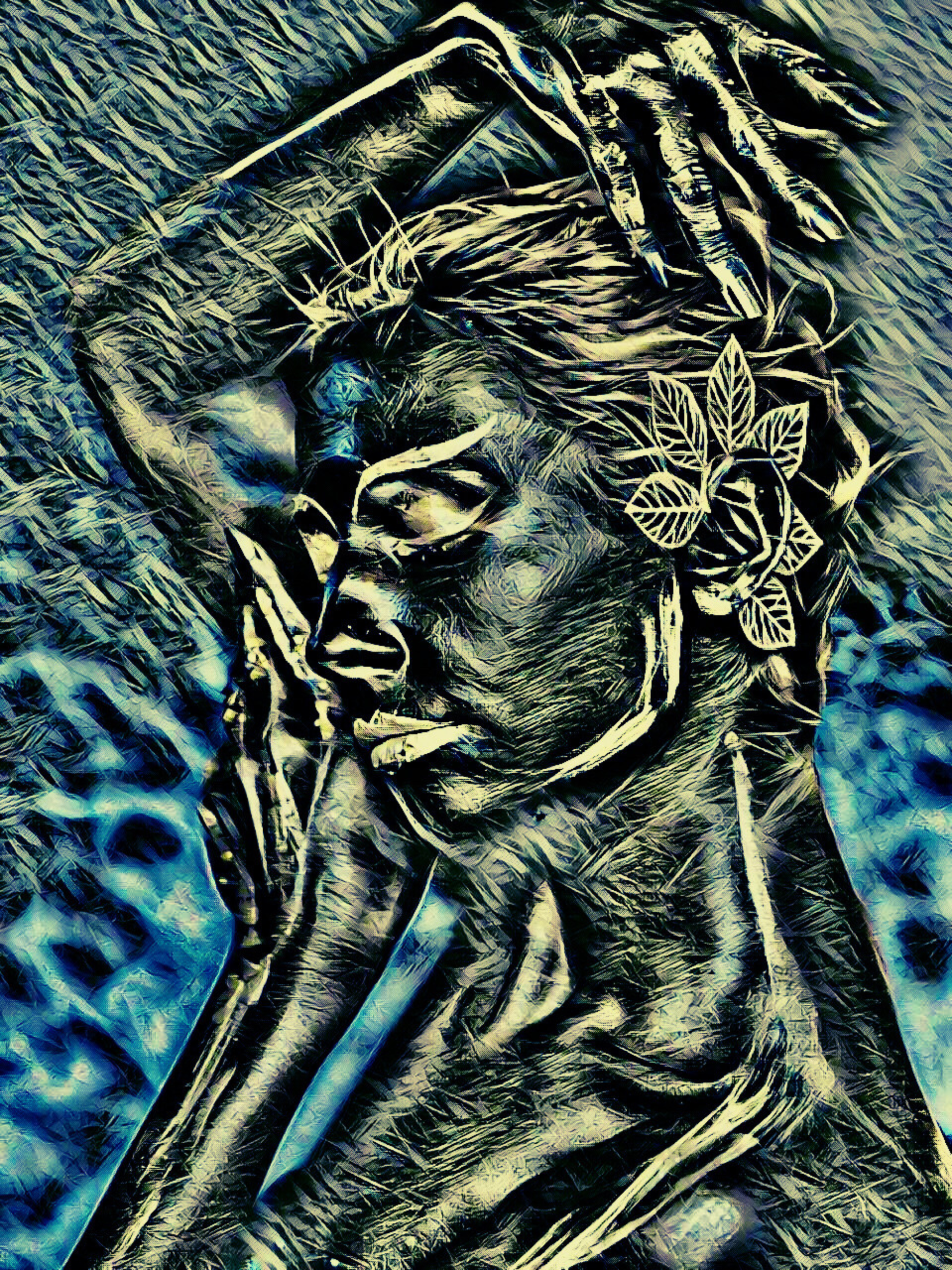 Uplift your room's decor with ElaniArt's FLORAL DREAMS Original Vibrant Silver Yellow Blue Sleeping Woman Flower in Hair Face Portrait Impressionistic Wall Artwork Print by ElaniArt.