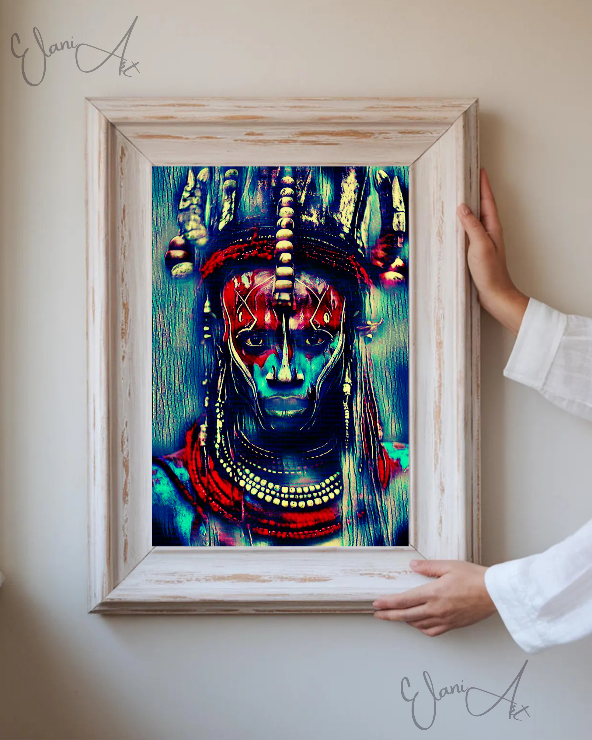 Uplift your room's decor with ElaniArt's HABARI Original Vibrant Blue Red 19th Century Tribal Warrior African Man Portraiture Impressionistic Wall Artwork Print by ElaniArt.