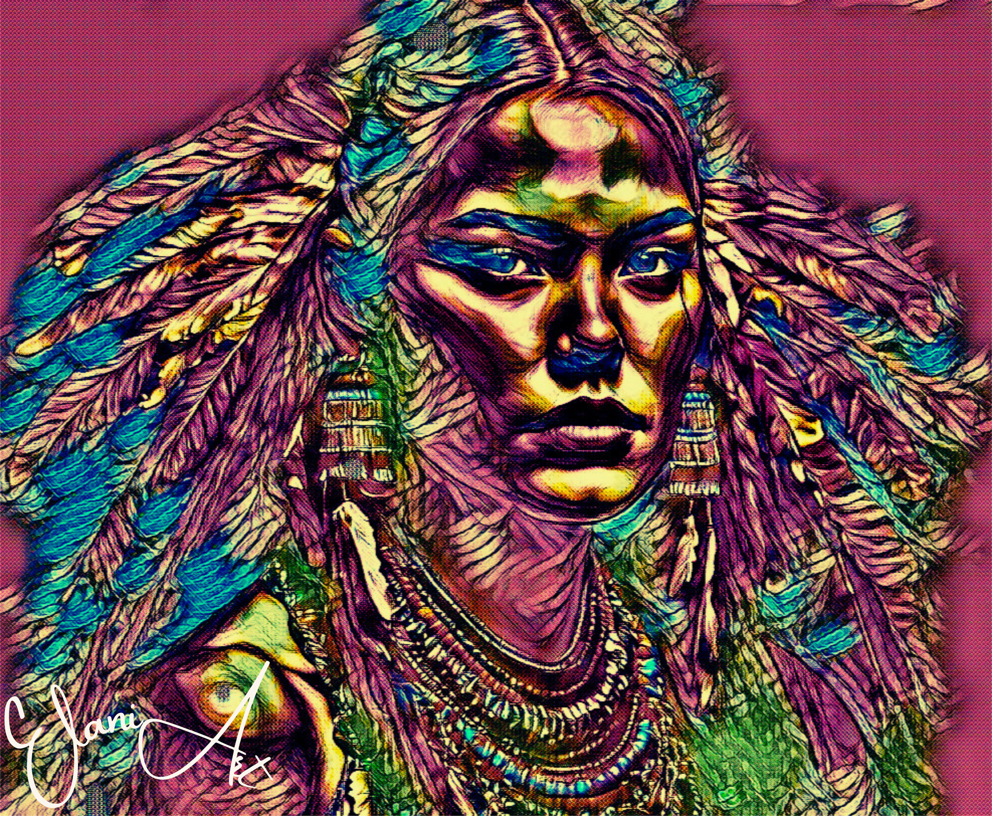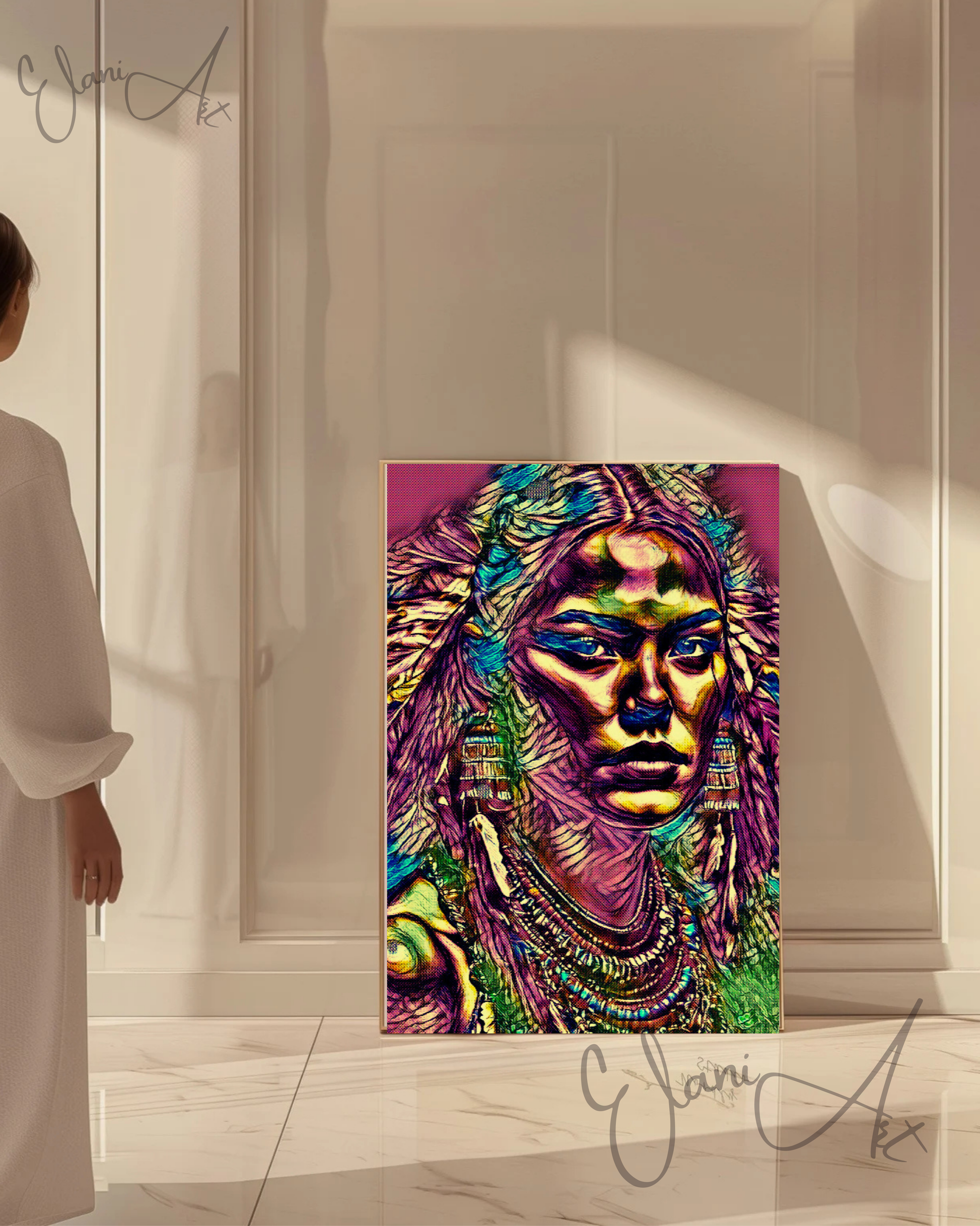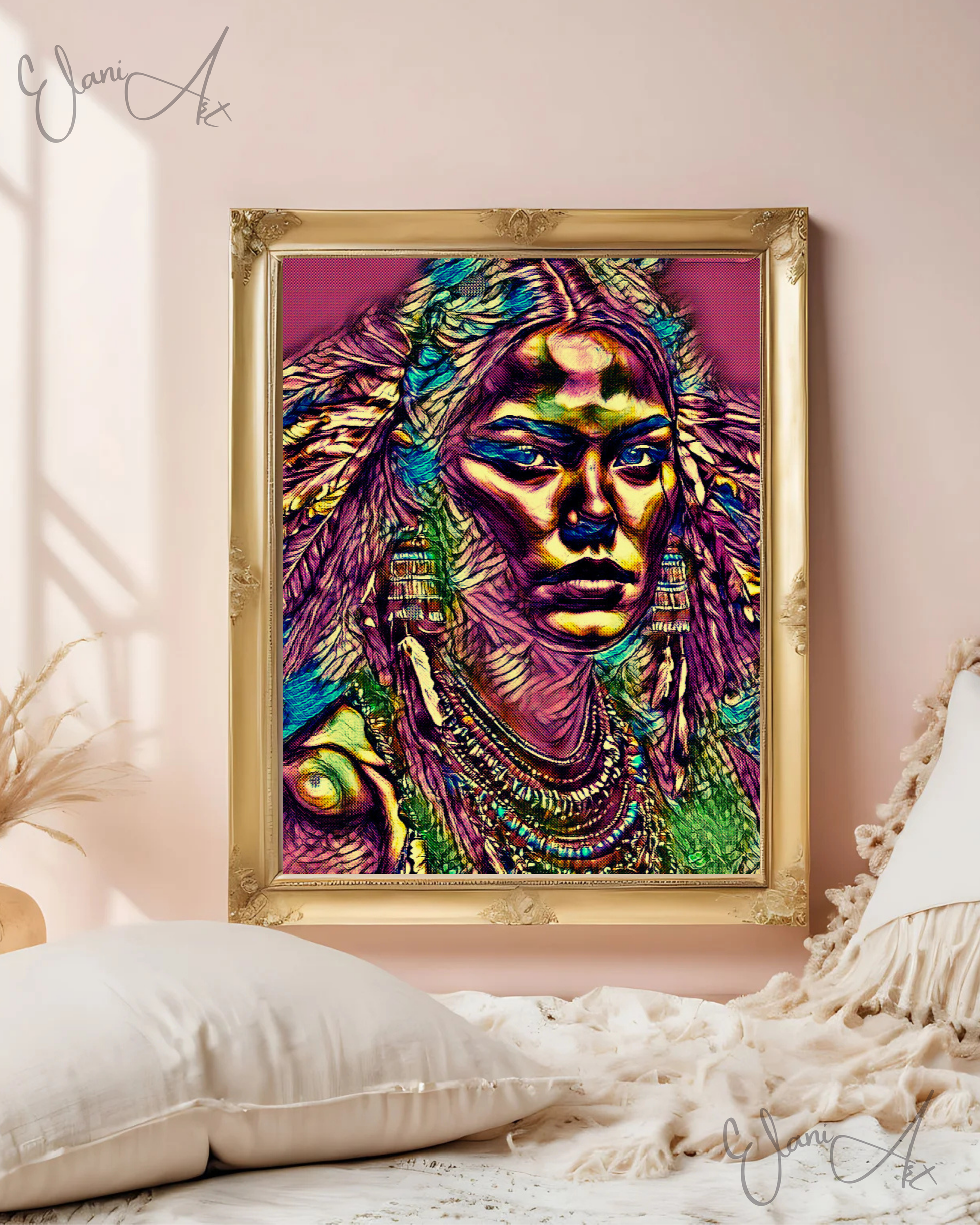 Uplift your room's decor with ElaniArt's JULIETTA Original Vibrant Pink Colorful Native American Woman Portrait Feather Headdress Impressionistic Wall Artwork Print by ElaniArt.