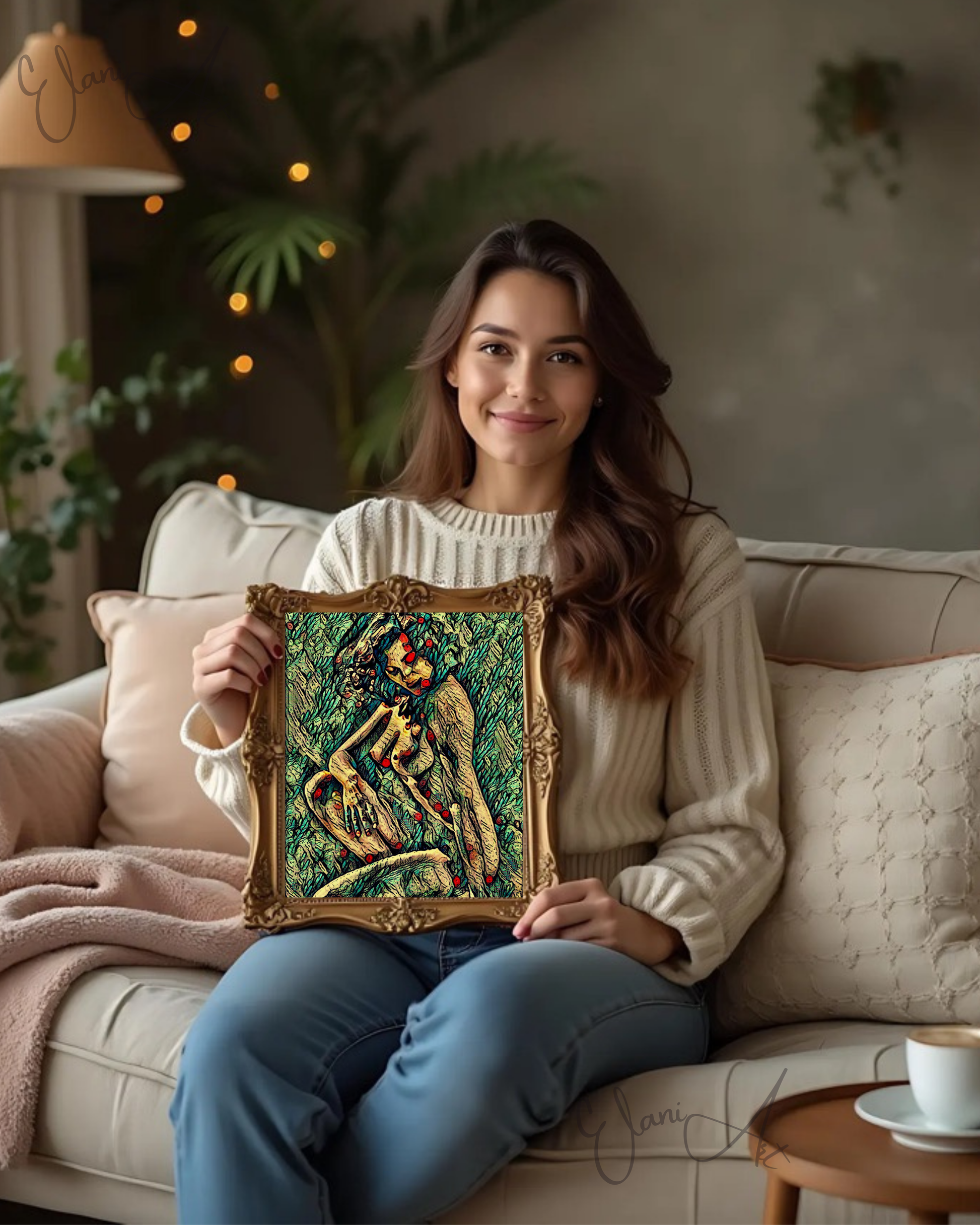 LUCIANA - An Original Vivid Green Plant-Like Erotic Woman Nude Sitting Portrait Impressionistic Wall Artwork Print - Erotic Art by ElaniArt