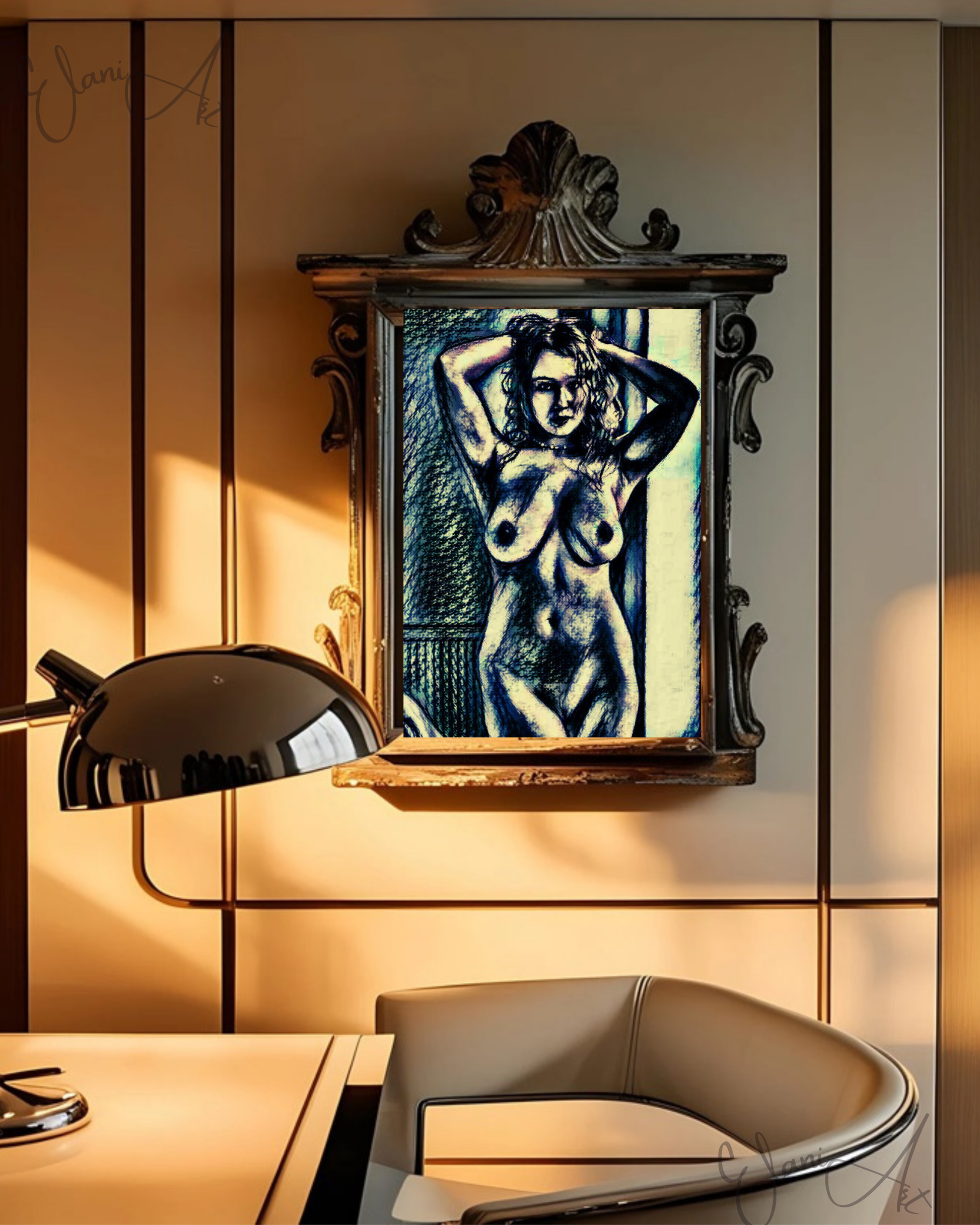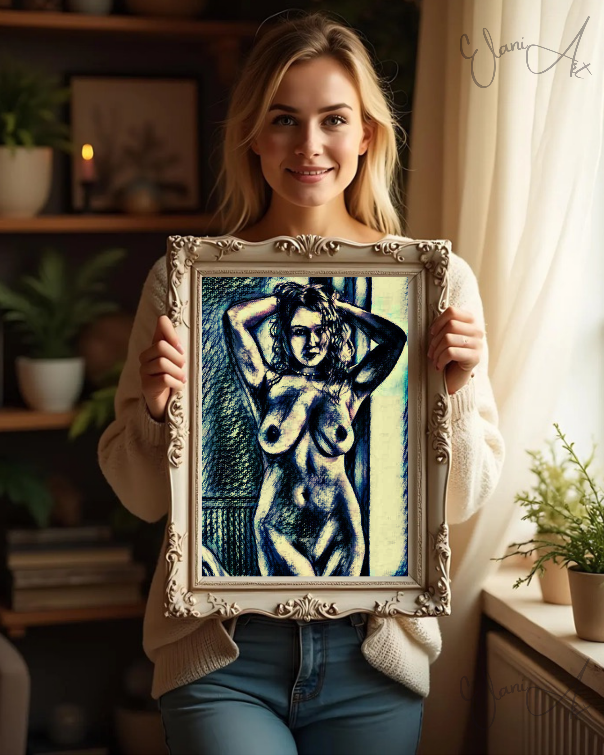 Uplift your room's decor with ElaniArt's MESSY HAIR Original Vivid Black Ivory Erotic Nude Woman Portrait Hands in Hair Impressionistic Wall Artwork Print - Erotic Art by ElaniArt.