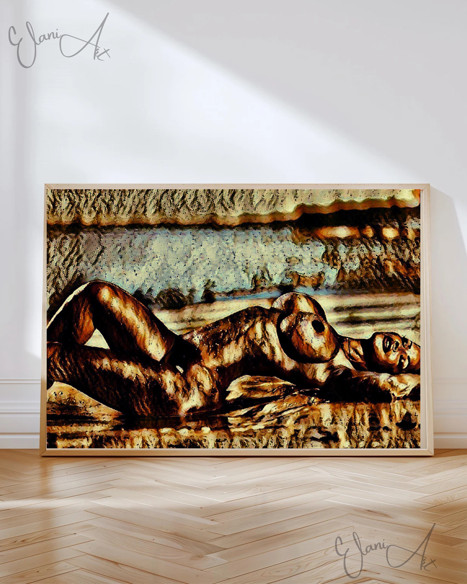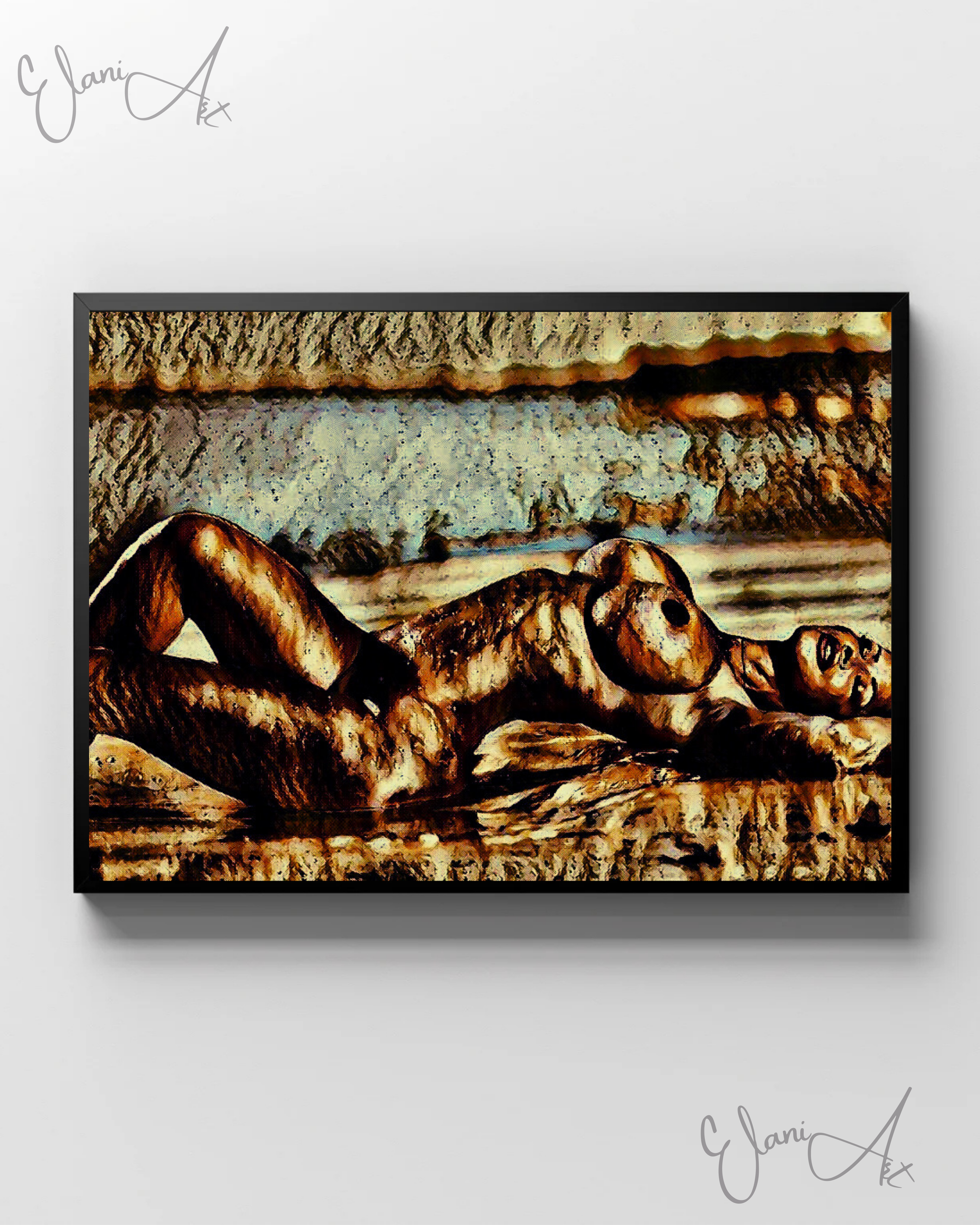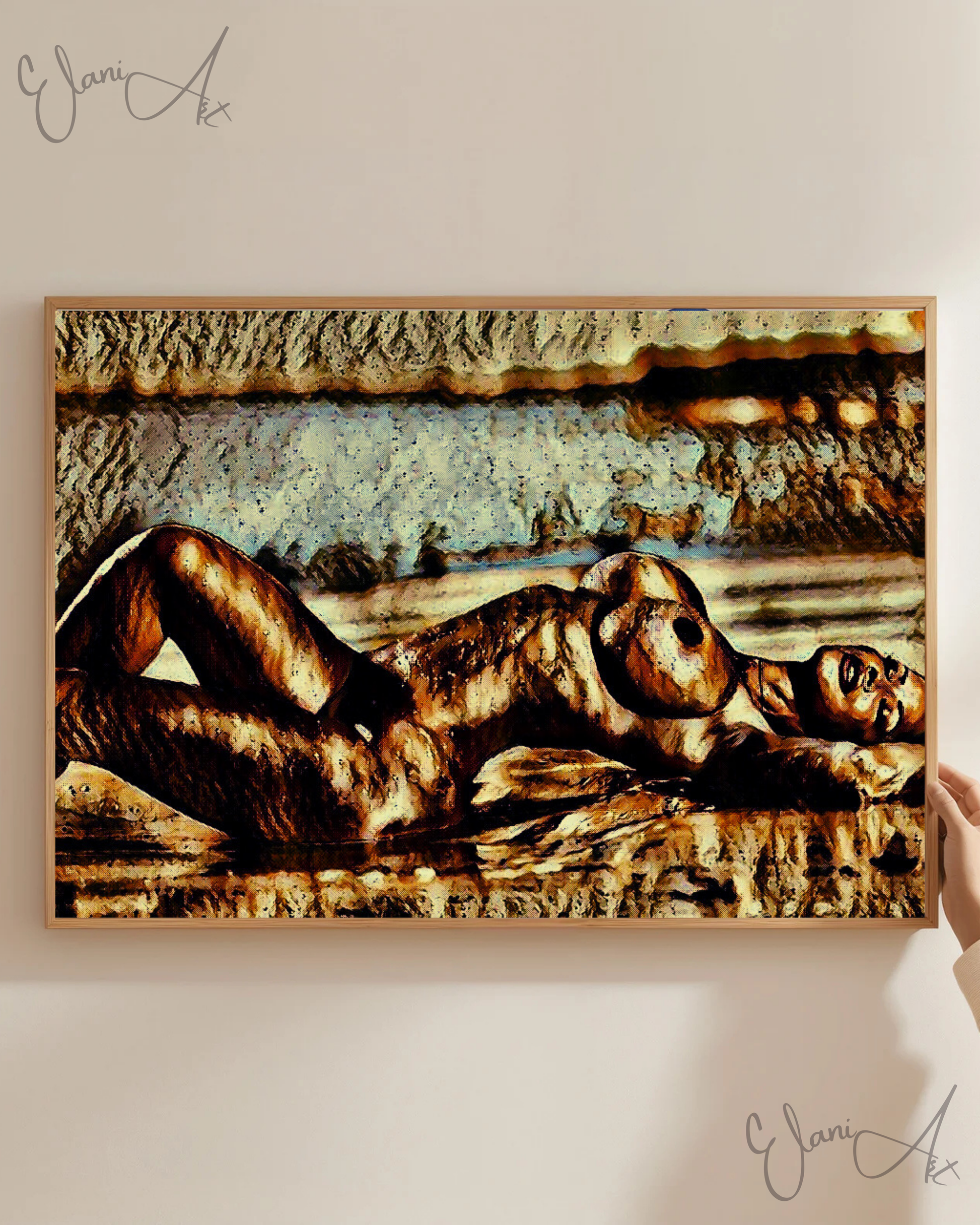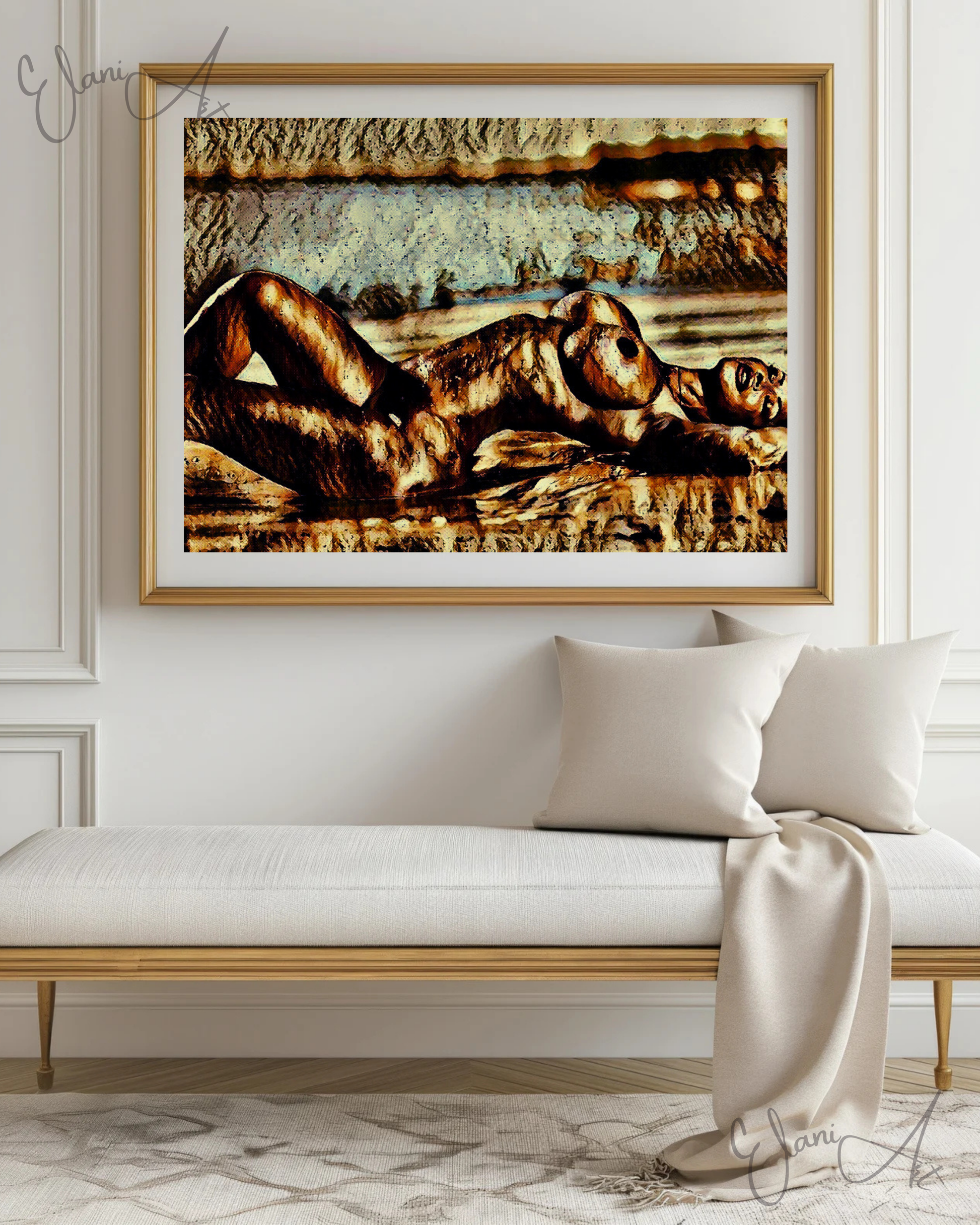 Uplift your room's decor with ElaniArt's ON THE BEACH Original Vibrant Bronze Erotic Nude Woman Laying on Beach Portrait Impressionistic Artwork Print - Erotic Art by ElaniArt.