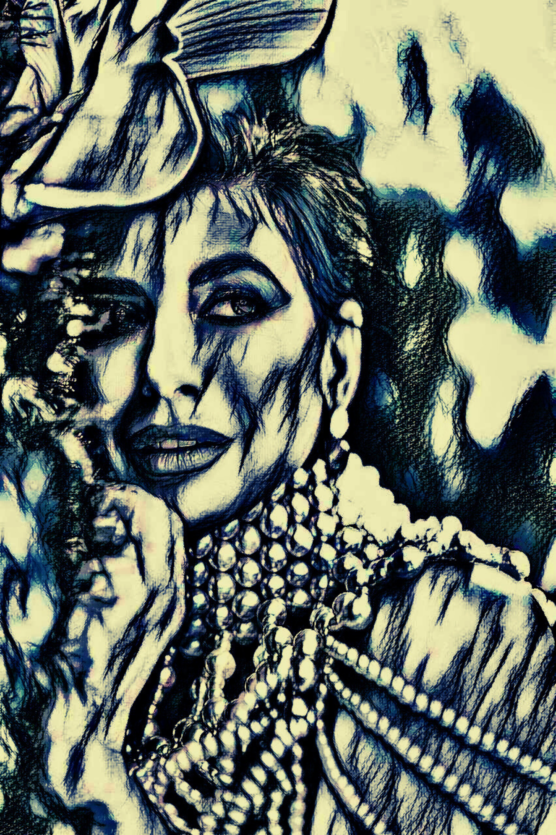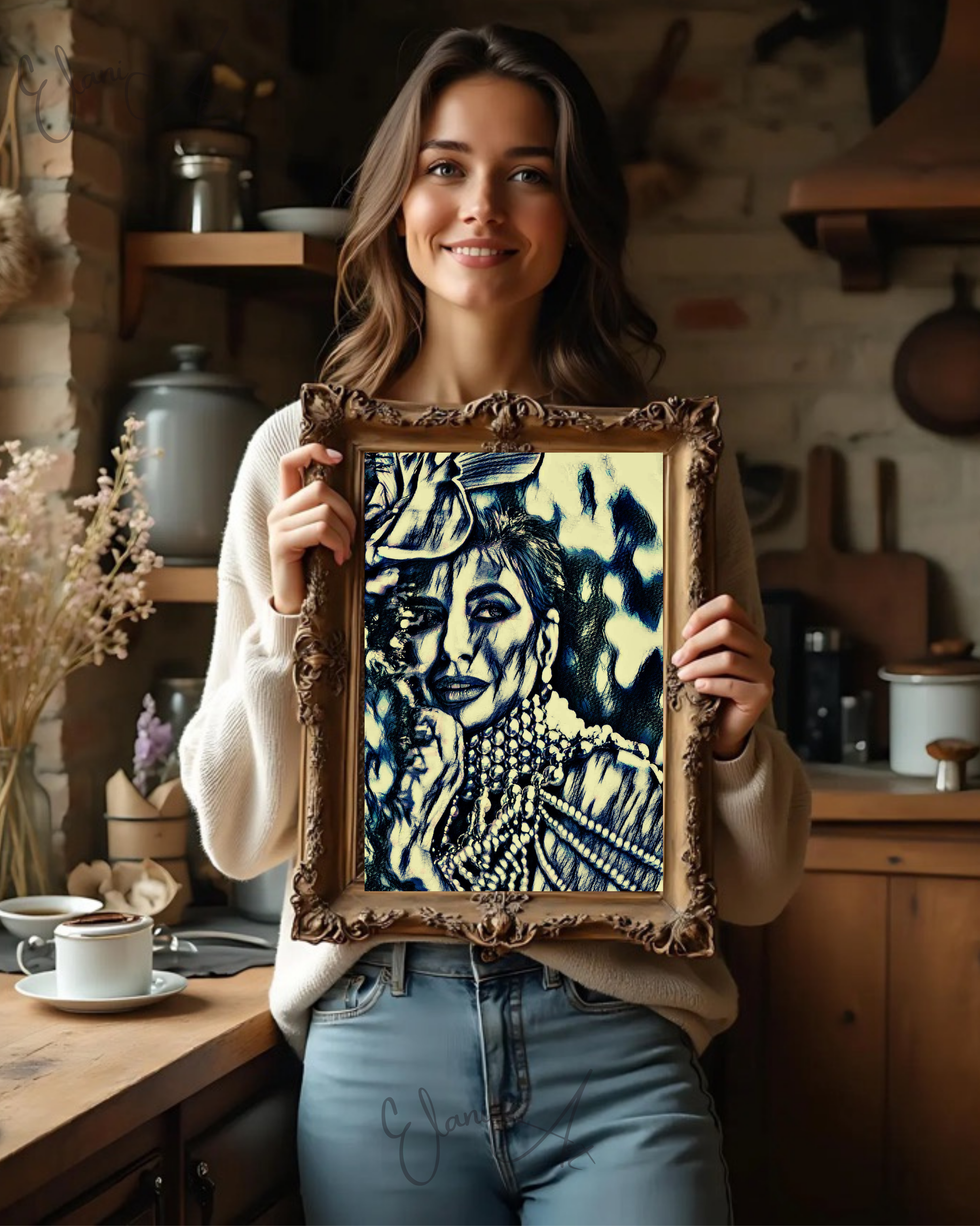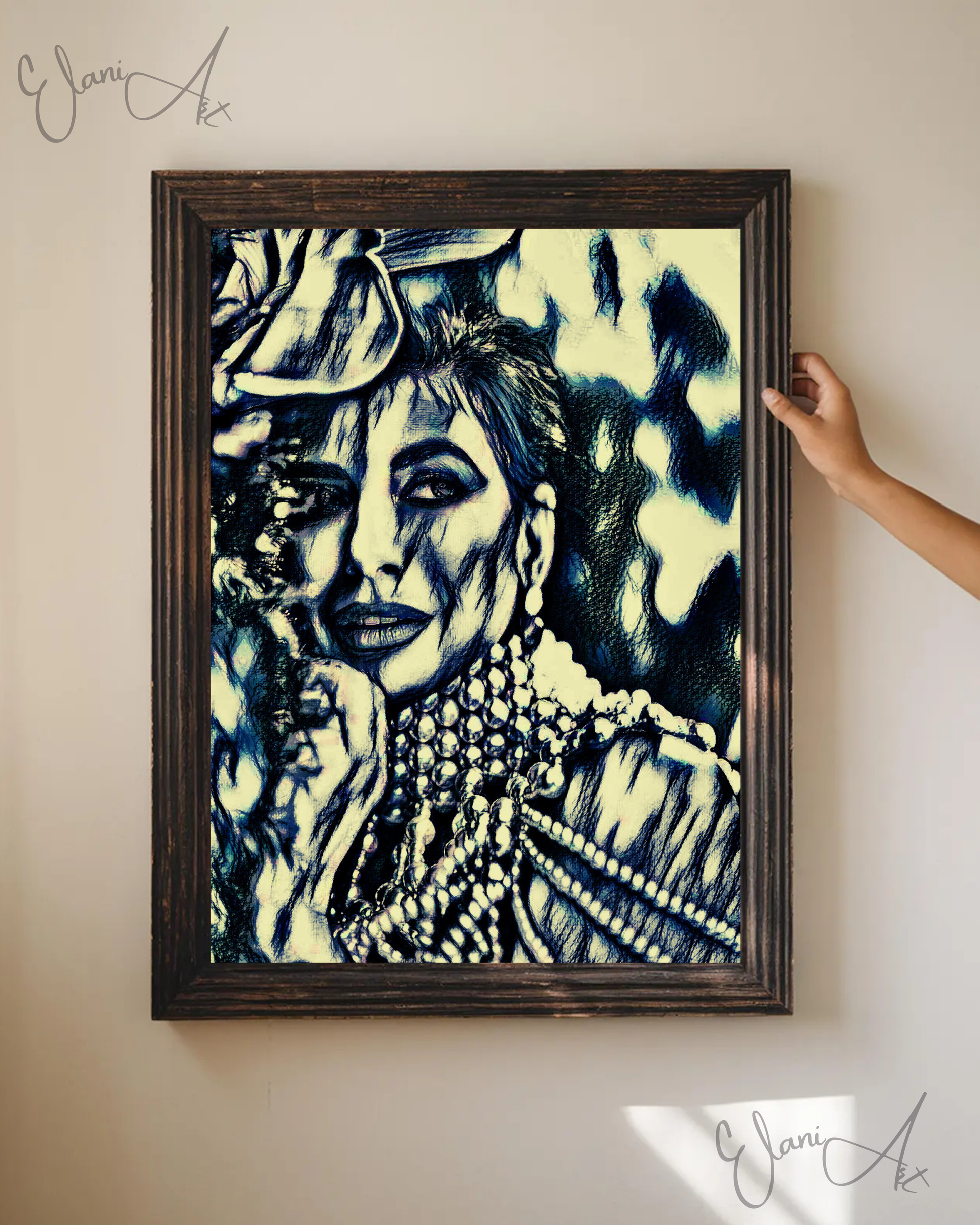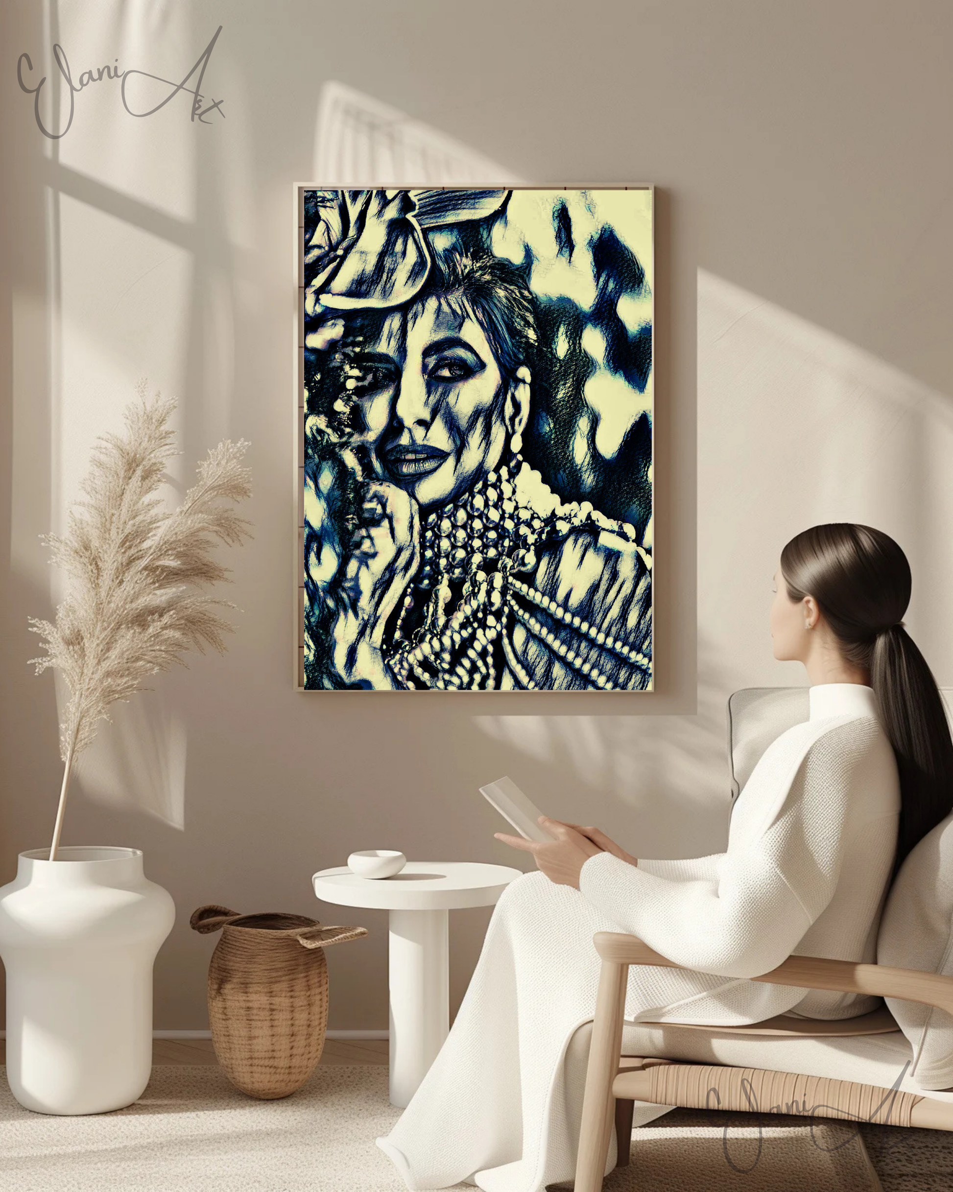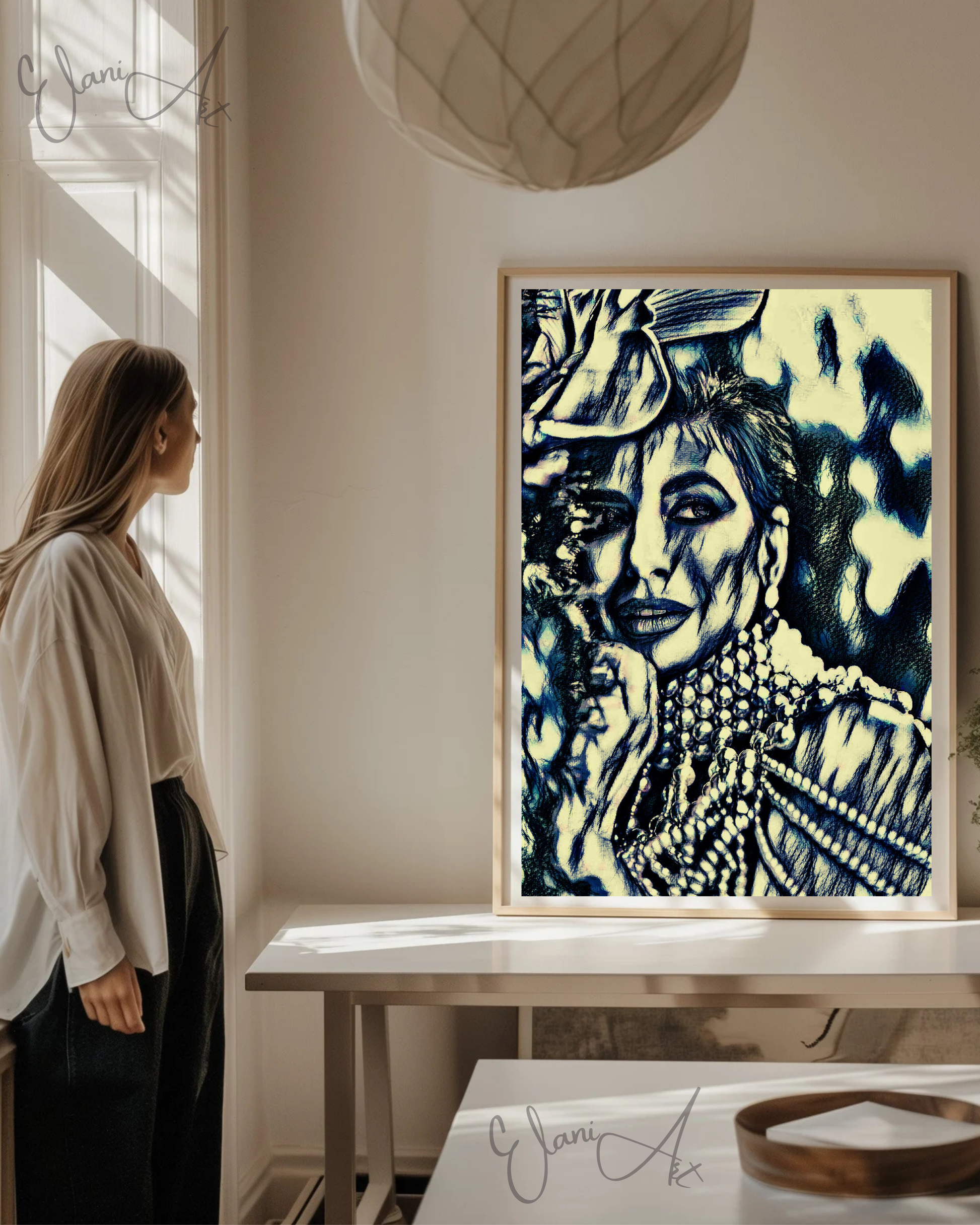 Uplift your room's decor with ElaniArt's PEARLA Original Vivid Black Ivory Blue Woman with Hat and Pearls Portraiture Art Deco Impressionistic Wall Artwork Print by ElaniArt.