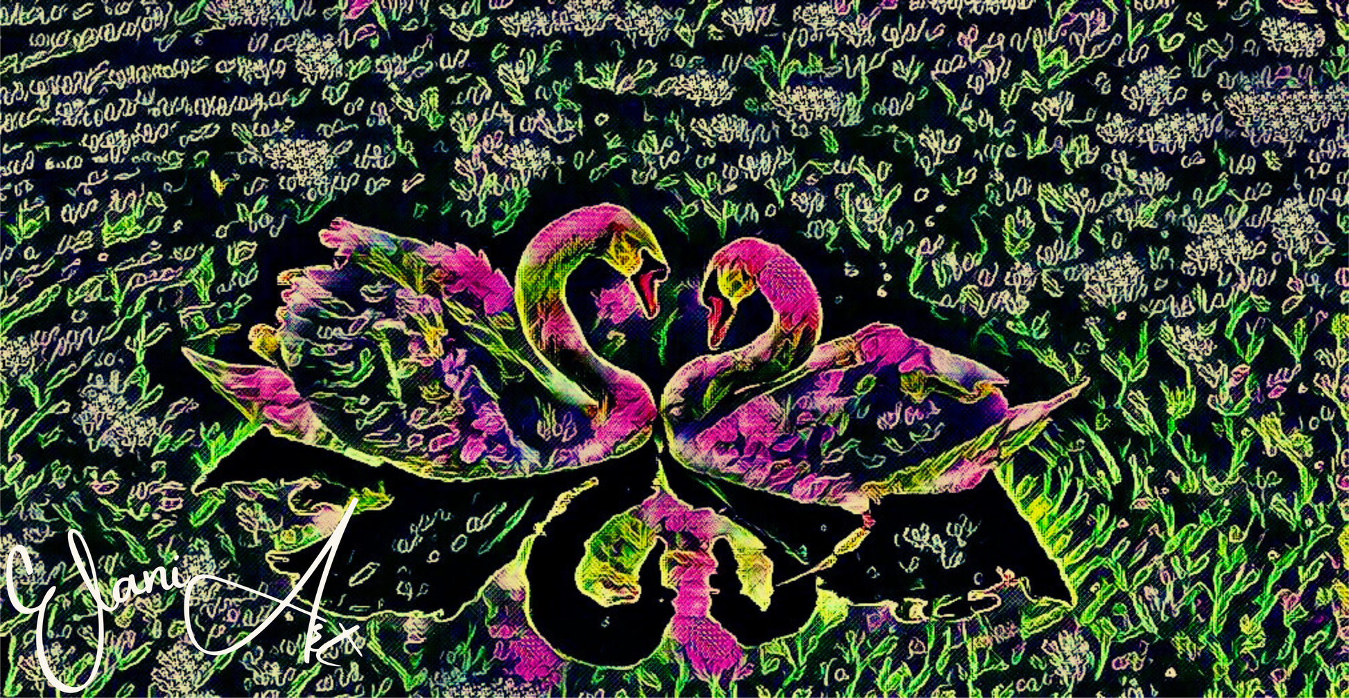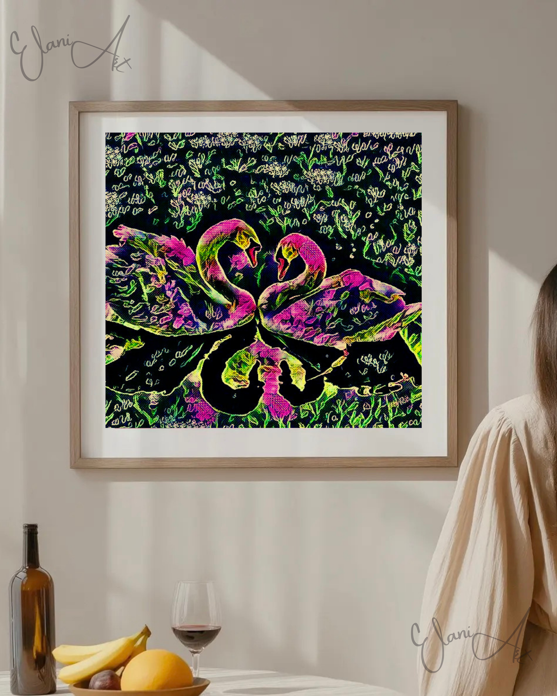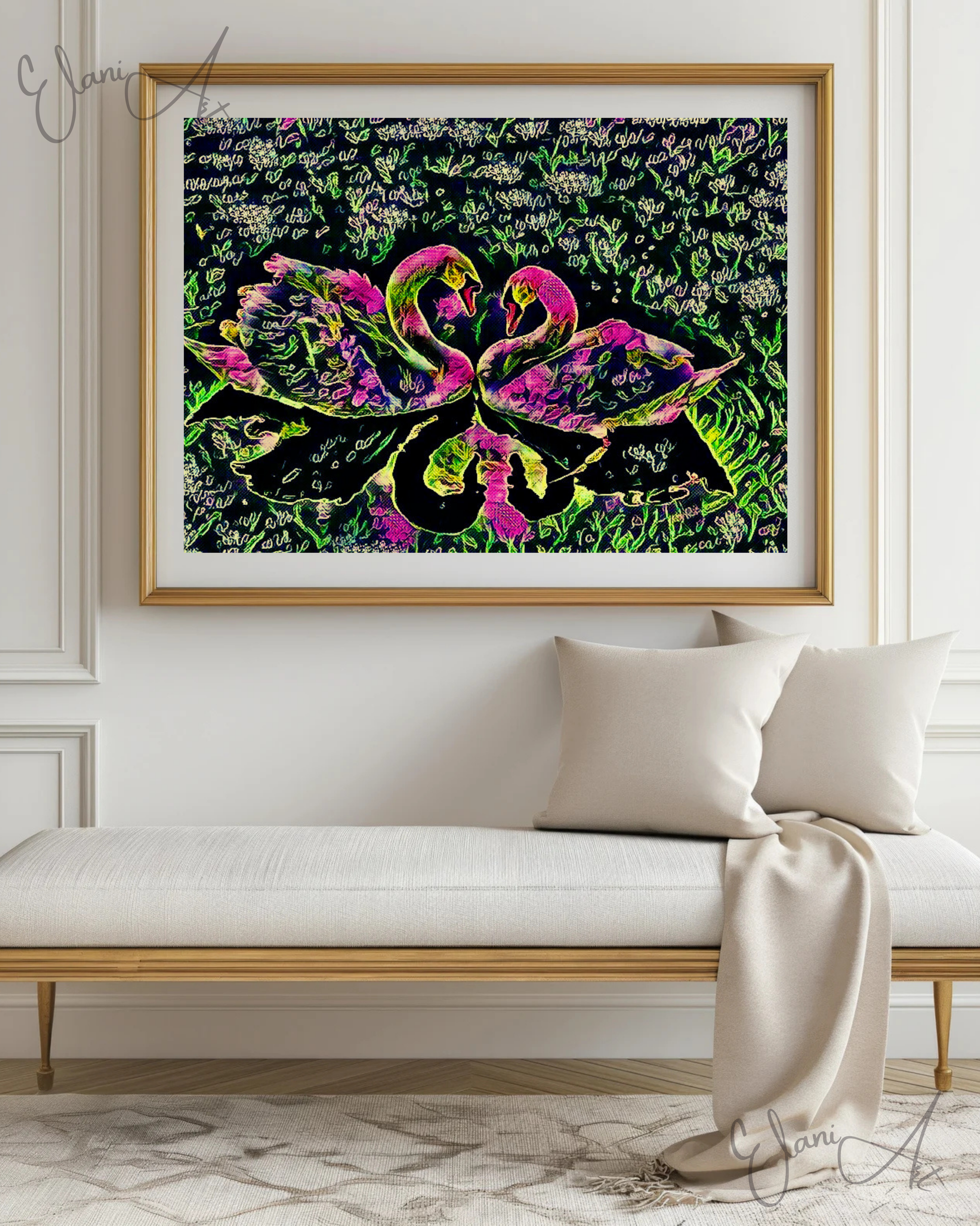 Uplift your room's decor with ElaniArt's SWAN LOVE Original Vibrant Colorful Pink Black Two Swans Swan Couple in a Grassy Pond Impressionistic Wall Artwork Print by ElaniArt.