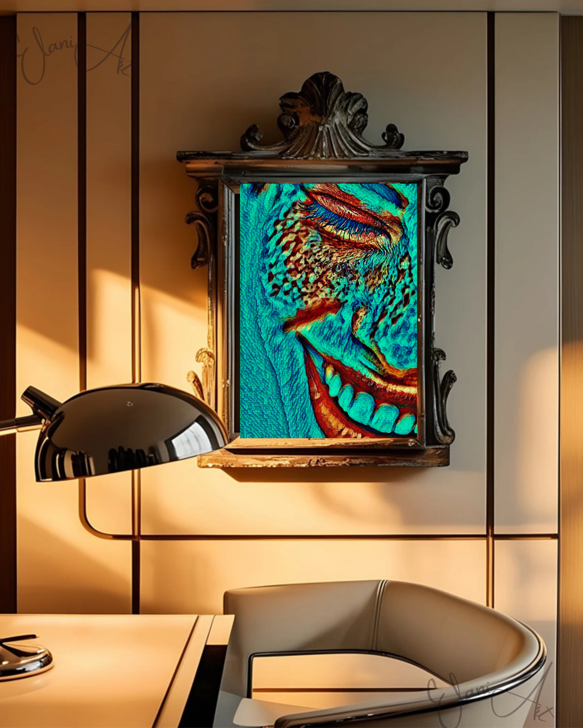 Uplift your room's decor with ElaniArt's THAT'S FUNNY Original Vibrant Blue Green Teal Woman Smiling Open Mouth Freckles Portrait Impressionistic Wall Artwork Print by ElaniArt.