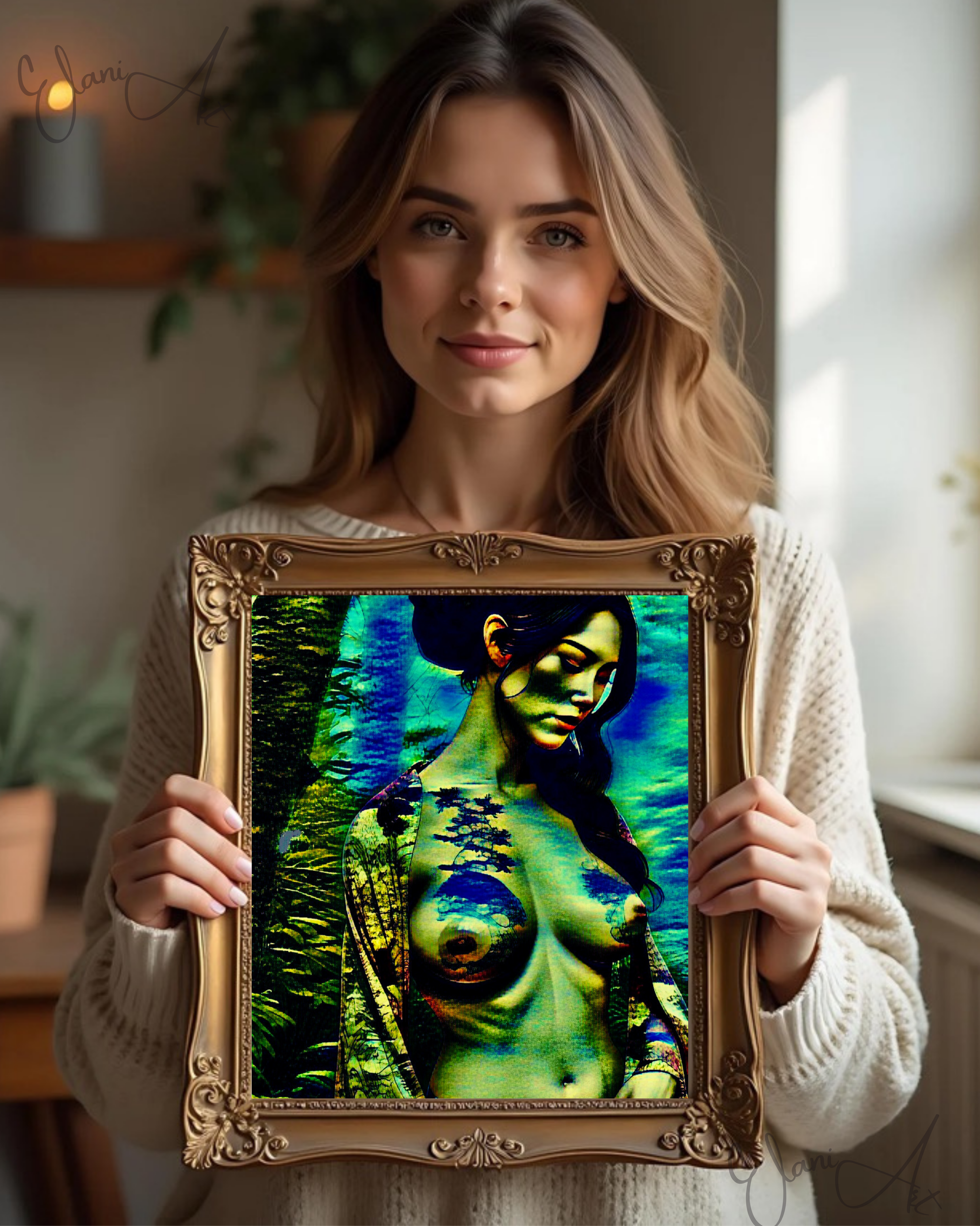 Uplift your room's decor with ElaniArt's THE DEMURE Original Vivid Blue Green Erotic Japanese Woman Topless Kimono Tattoo Impressionistic Artwork Print - Erotic Art by ElaniArt.