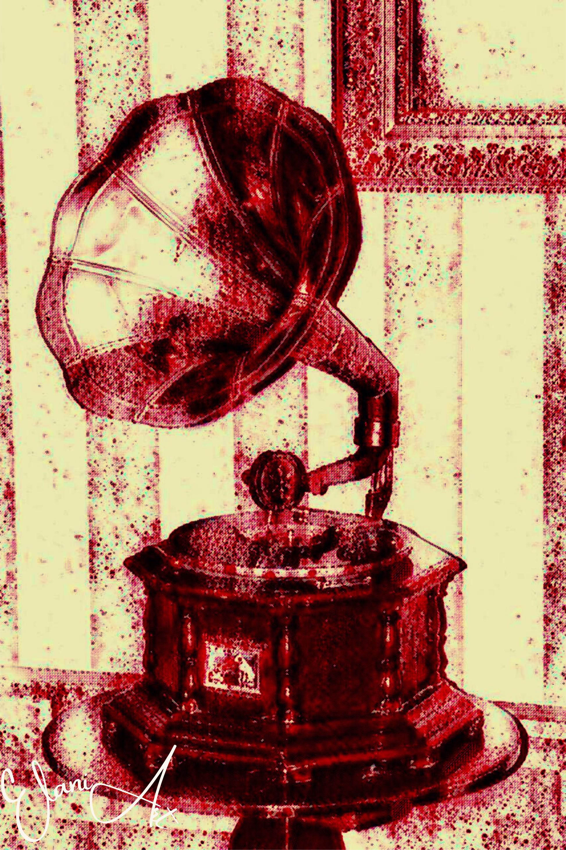 Uplift your room's decor with ElaniArt's THE GRAMOPHONE Original Vivid Red Ivory Phonograph 1940s Record Player Turntable Music Impressionistic Wall Artwork Print by ElaniArt.