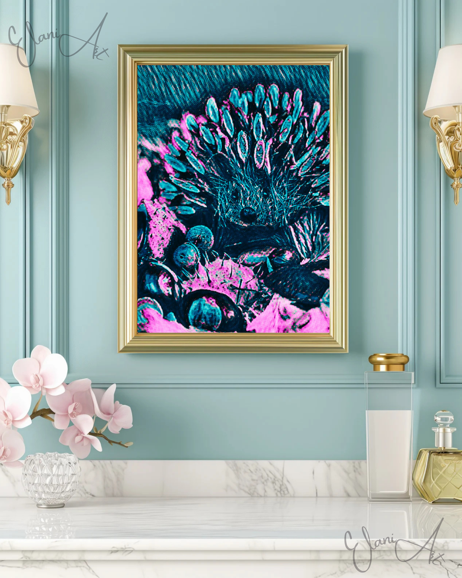 Uplift your room's decor with ElaniArt's THE HEDGEHOG Original Vibrant Pink Blue Colorful Hedgehog Spiny Mammal Wildlife Portraiture Impressionistic Wall Artwork Print by ElaniArt.