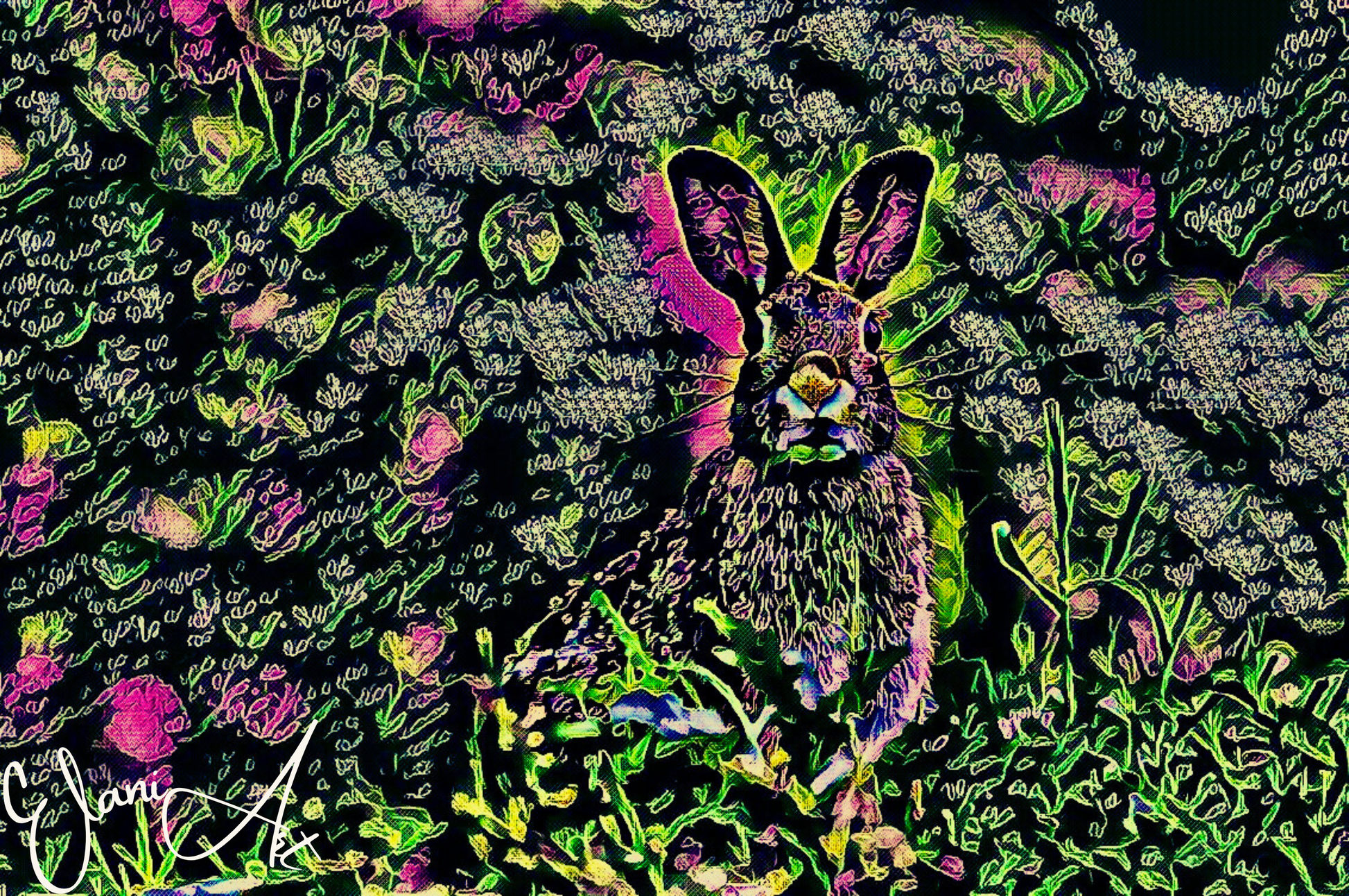 Uplift your room's decor with ElaniArt's THE RABBIT Original Vibrant Pink Green Colorful CottonTail Rabbit Animal WildLife Portrait Impressionistic Wall Artwork Print by ElaniArt.