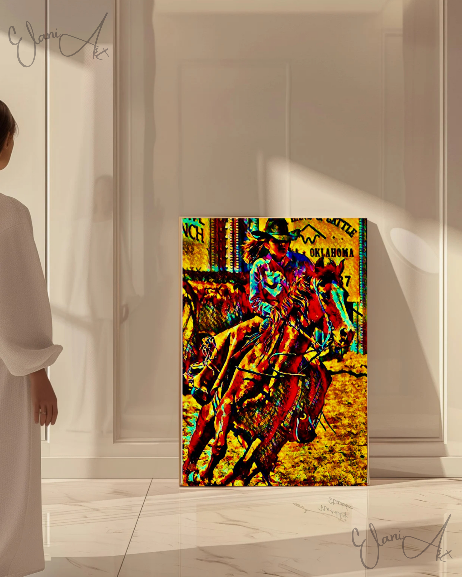 Uplift your room's decor with ElaniArt's THE RIDER Original Vibrant Golden Brown Woman Rider and a Horse Cowgirl Rodeo Equestrian Sport Horseback Wall Artwork Print by ElaniArt.