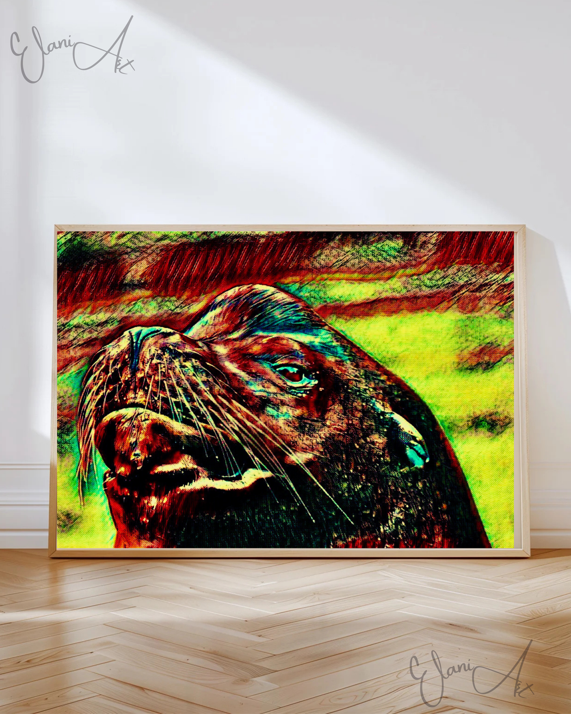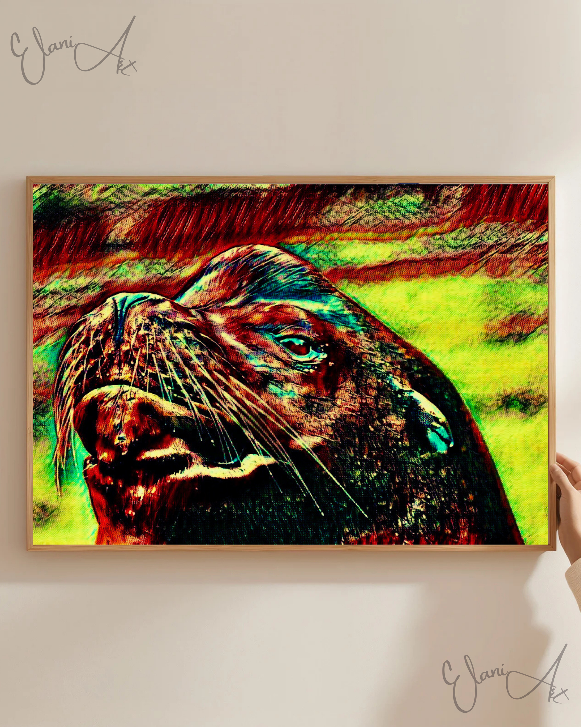 Uplift your room's decor with ElaniArt's THE SEA LION Original Vivid Red Yellow Sea Lion Pinniped Whiskers Marine Mammal Portrait Impressionistic Wall Artwork Print by ElaniArt.