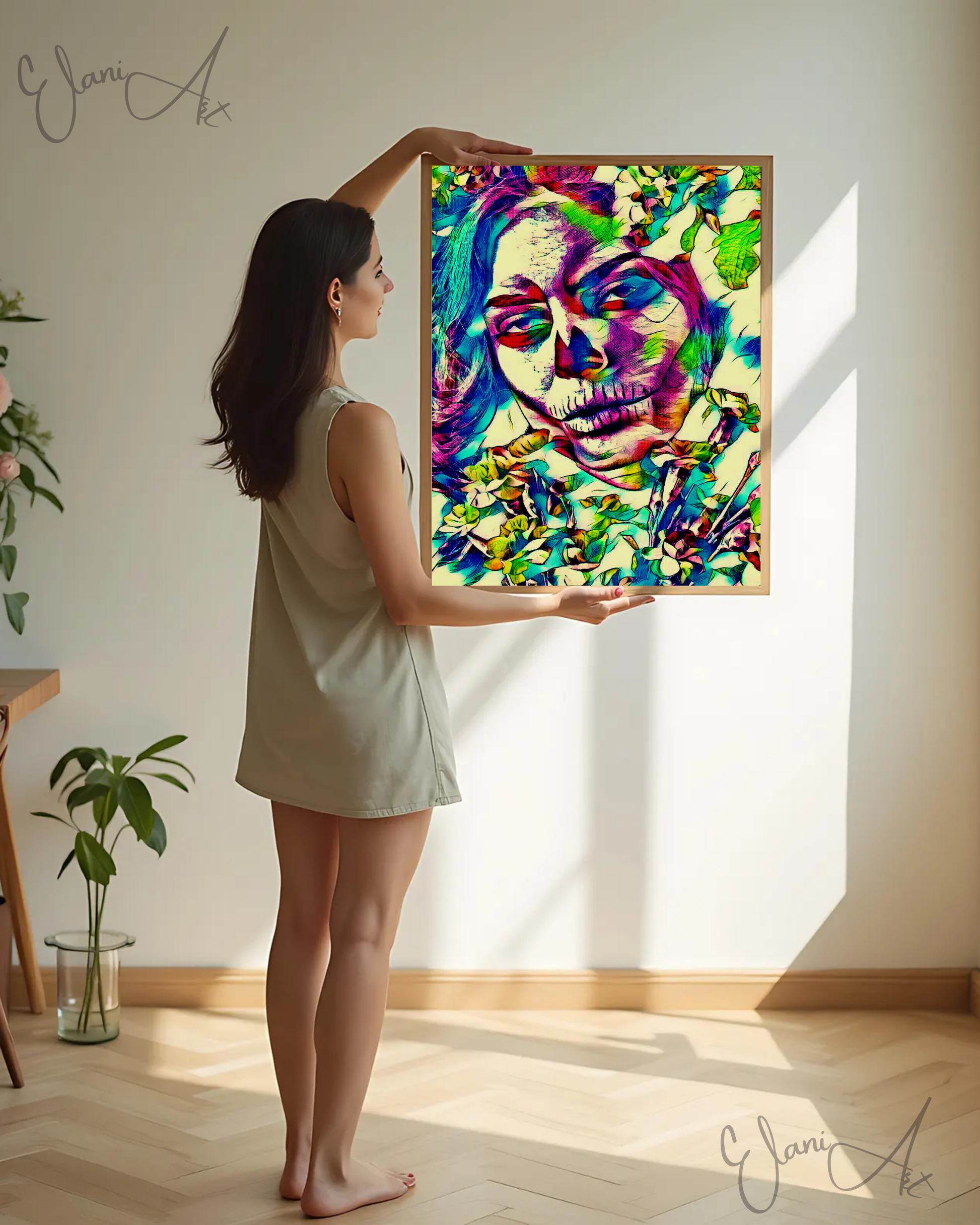 Uplift your room's decor with ElaniArt's THE SLEEPLESS NIGHT Original Vibrant Pink Day of the Dead Woman Floral Stitched Mouth Impressionistic Wall Artwork Print by ElaniArt.