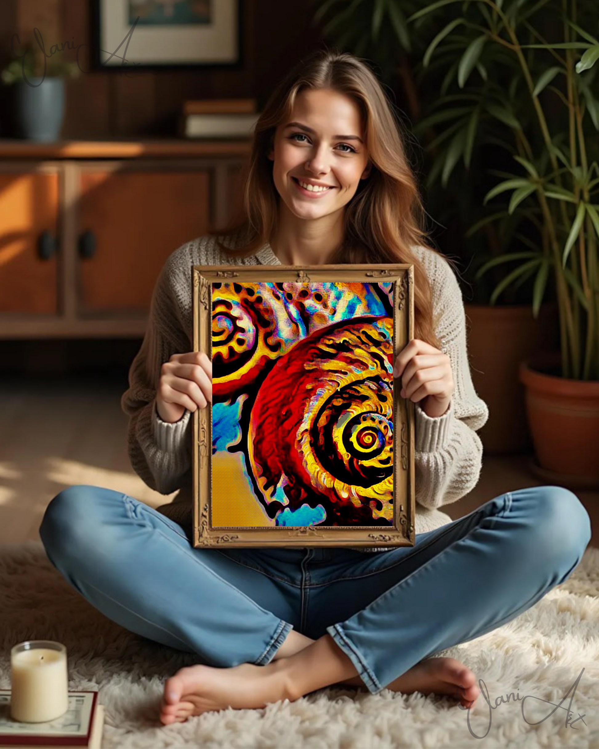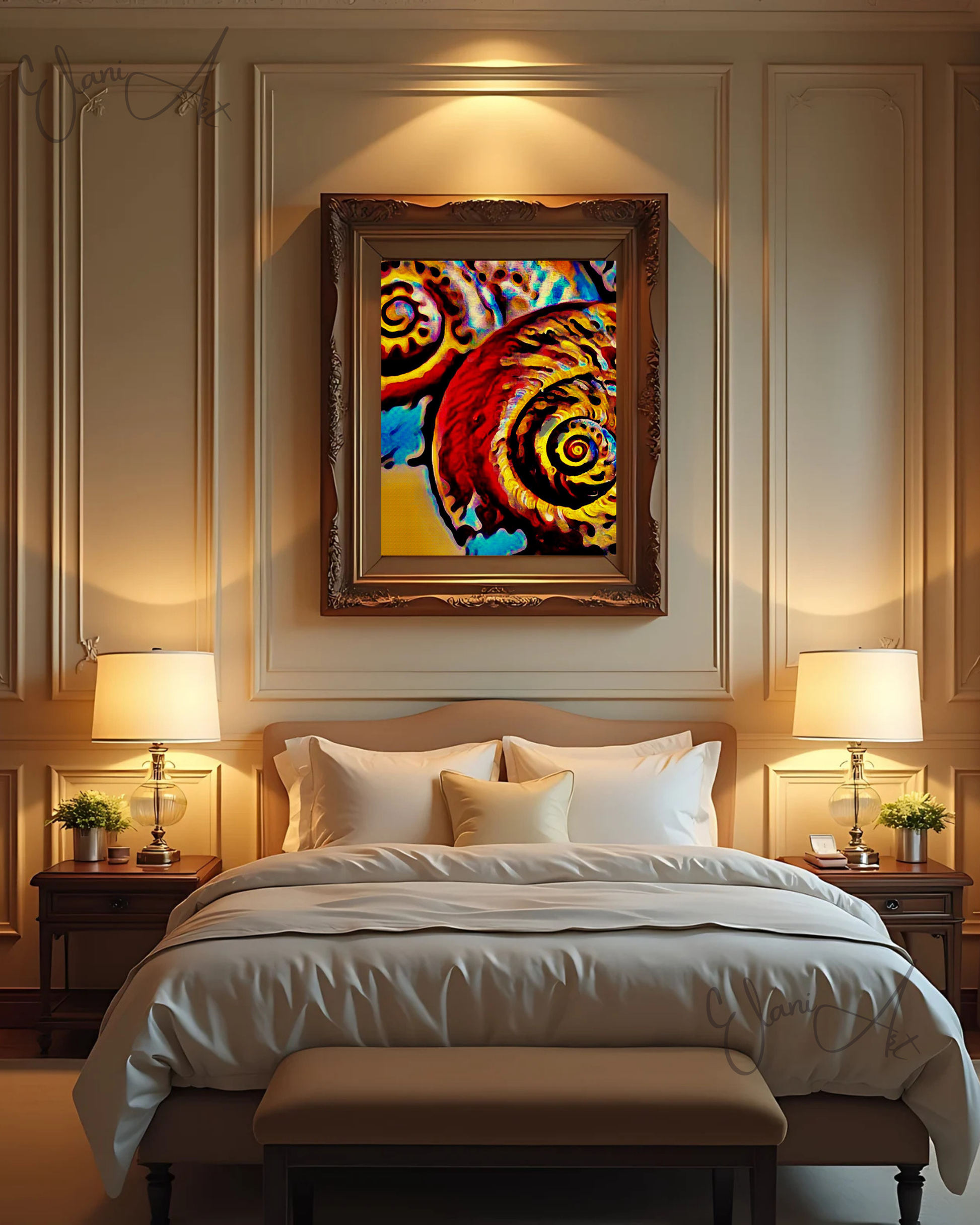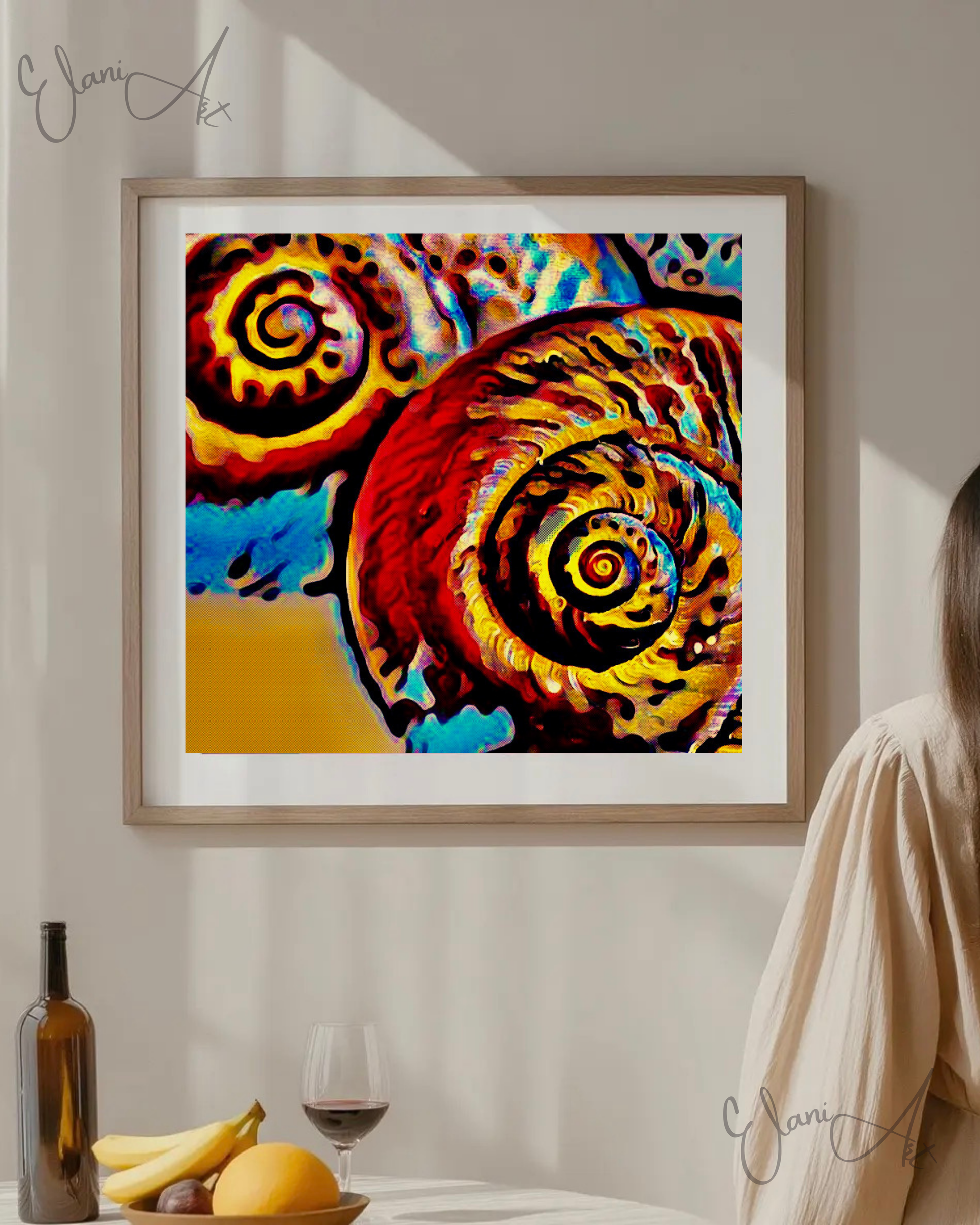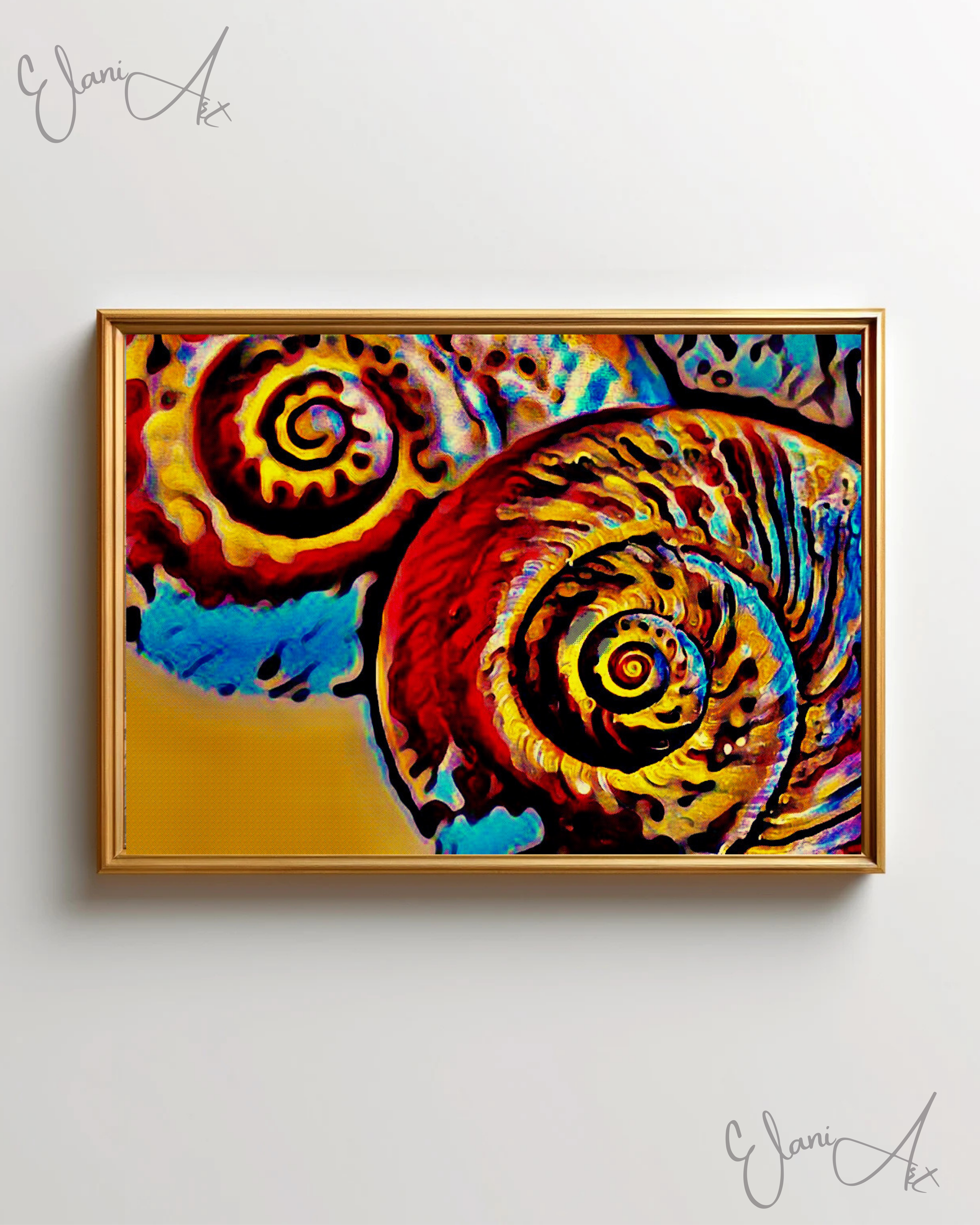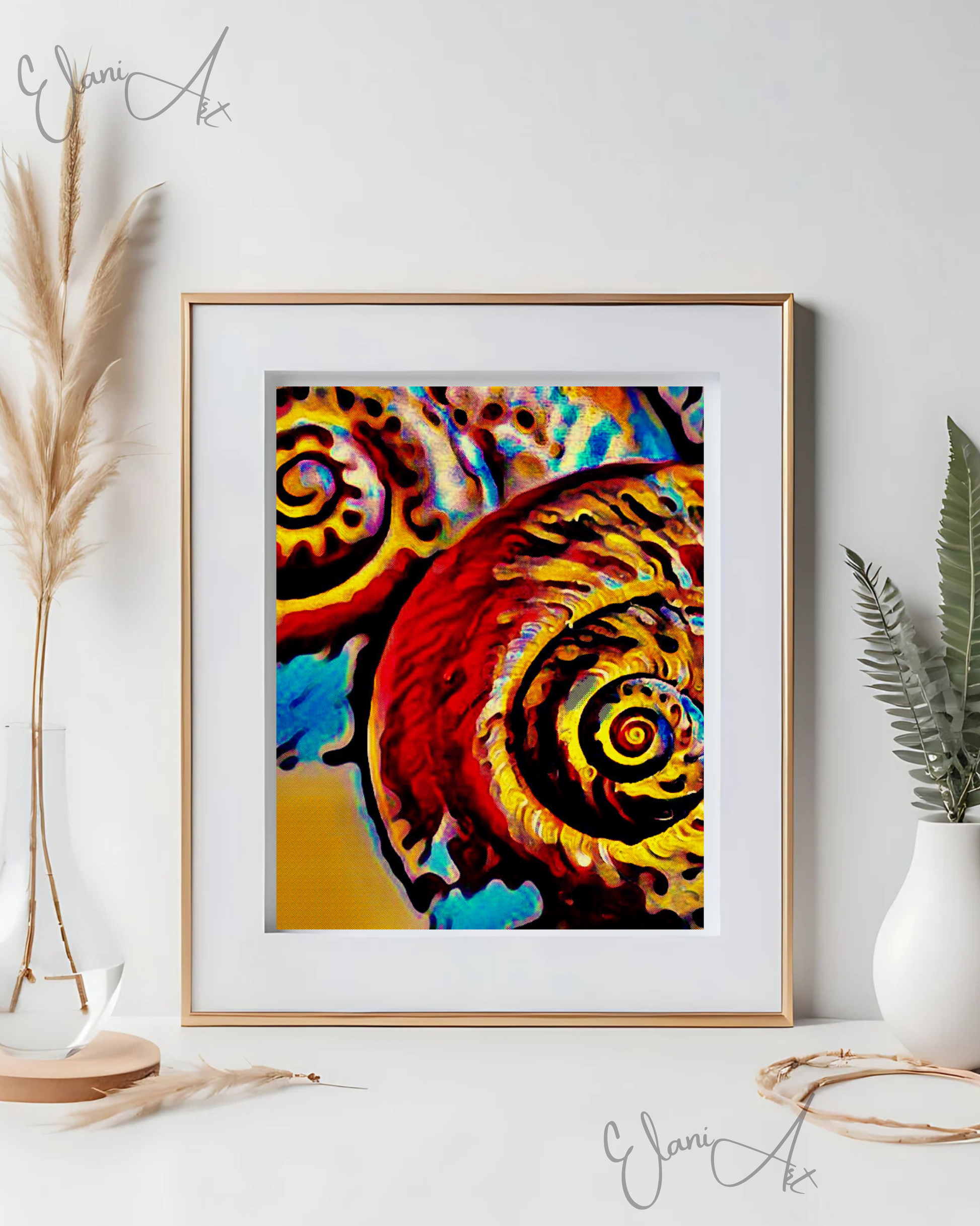 Uplift your room's decor with ElaniArt's THE SNAILS Original Vibrant Red Yellow Colorful Coiled Shelled Snails Gastropods Impressionistic Wall Artwork Print by ElaniArt.