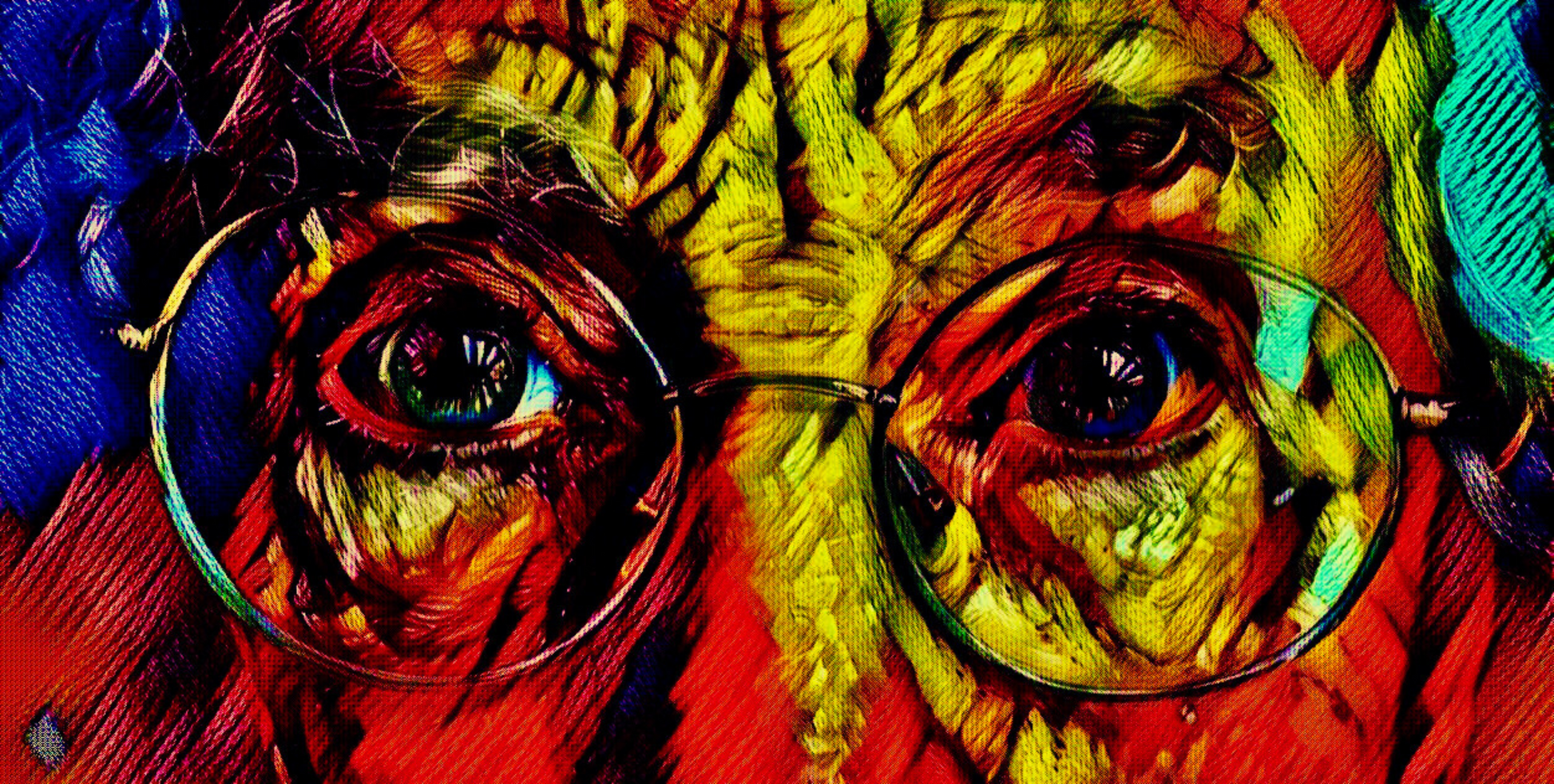 Uplift your room's decor with ElaniArt's THROUGH MY EYES Original Vibrant Colorful Old Man Eyes with Glasses Close-Up Portrait Impressionistic Wall Artwork Print by ElaniArt.