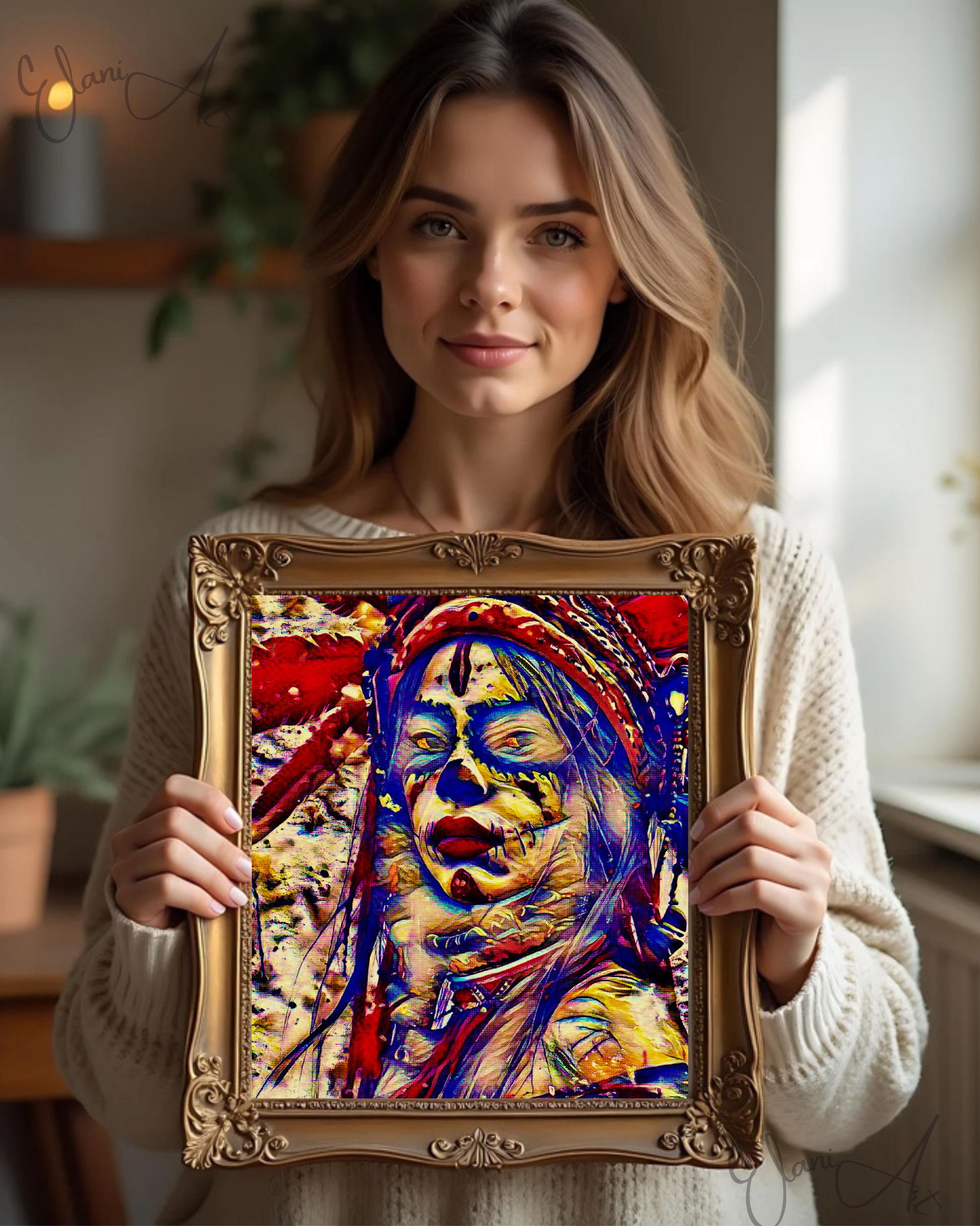 Uplift your room's decor with ElaniArt's TRIBAL Original Vibrant Red Tribal Spiritual Indigenous Woman in Feathered Headdress Red Lips Impressionistic Artwork Print by ElaniArt.