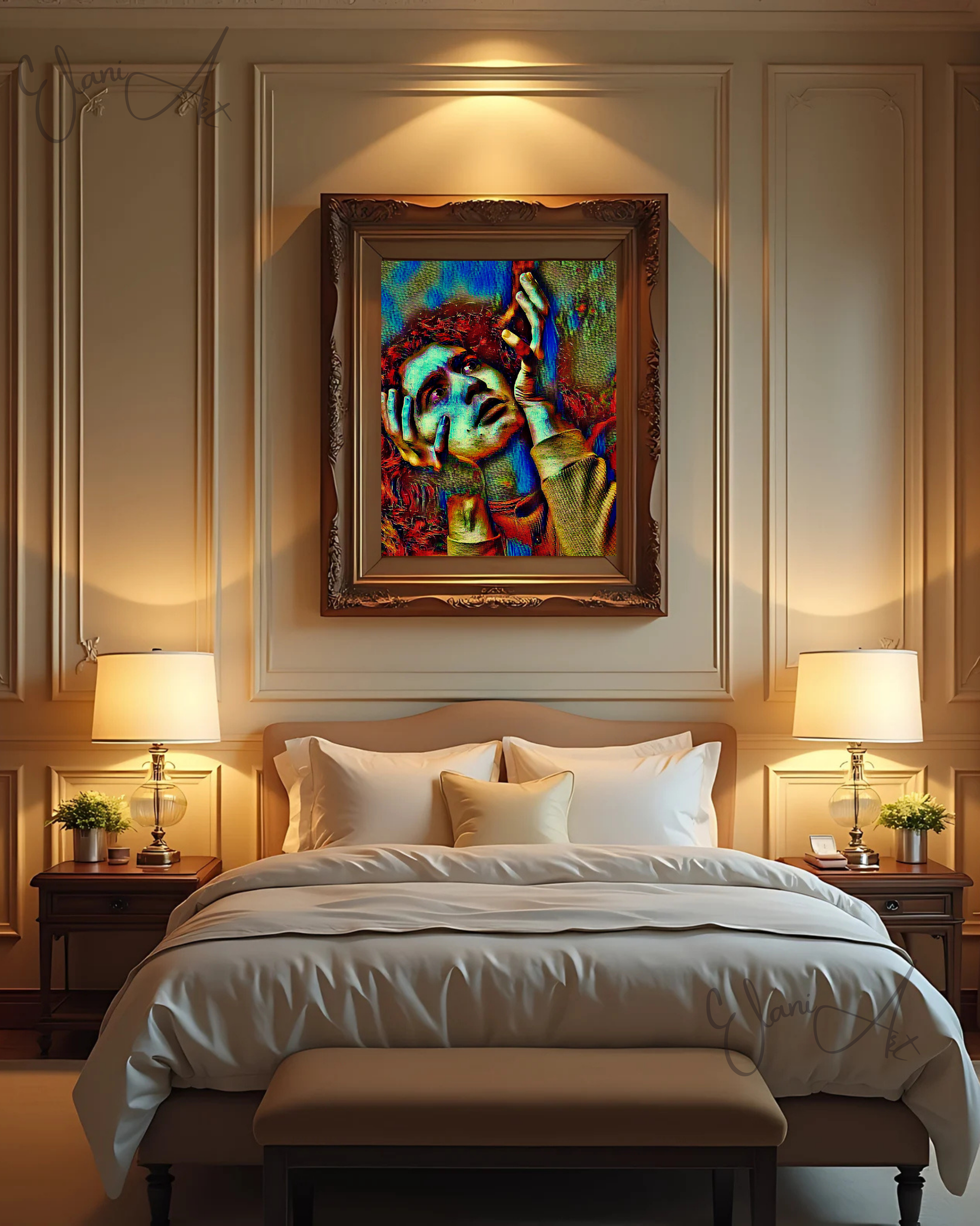 Uplift your room's decor with ElaniArt's WHY Original Vibrant Colorful Man Expressive Portraiture Red Hair Wide Eyes Hand Gesture Impressionistic Wall Artwork Print by ElaniArt.